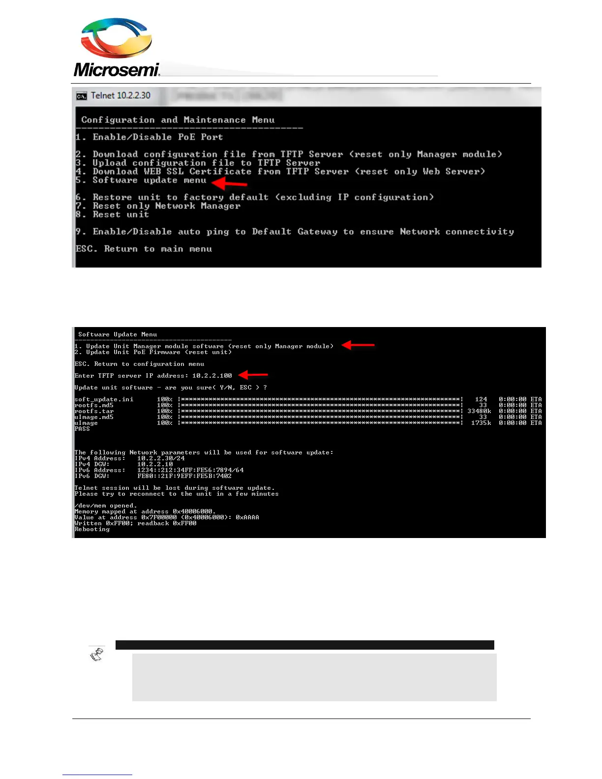 Telnet/SSH session will be lost during to the software update process. However, PoE power will remain