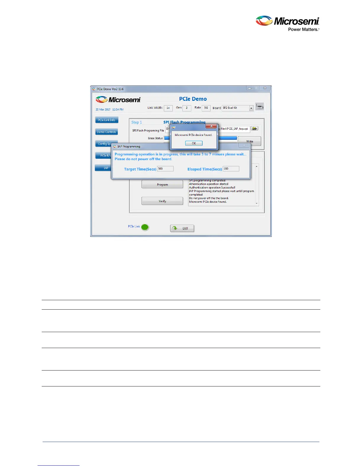 On completion of the IAP program, the GUI displays a Microsemi PCIe Device Found message as shown