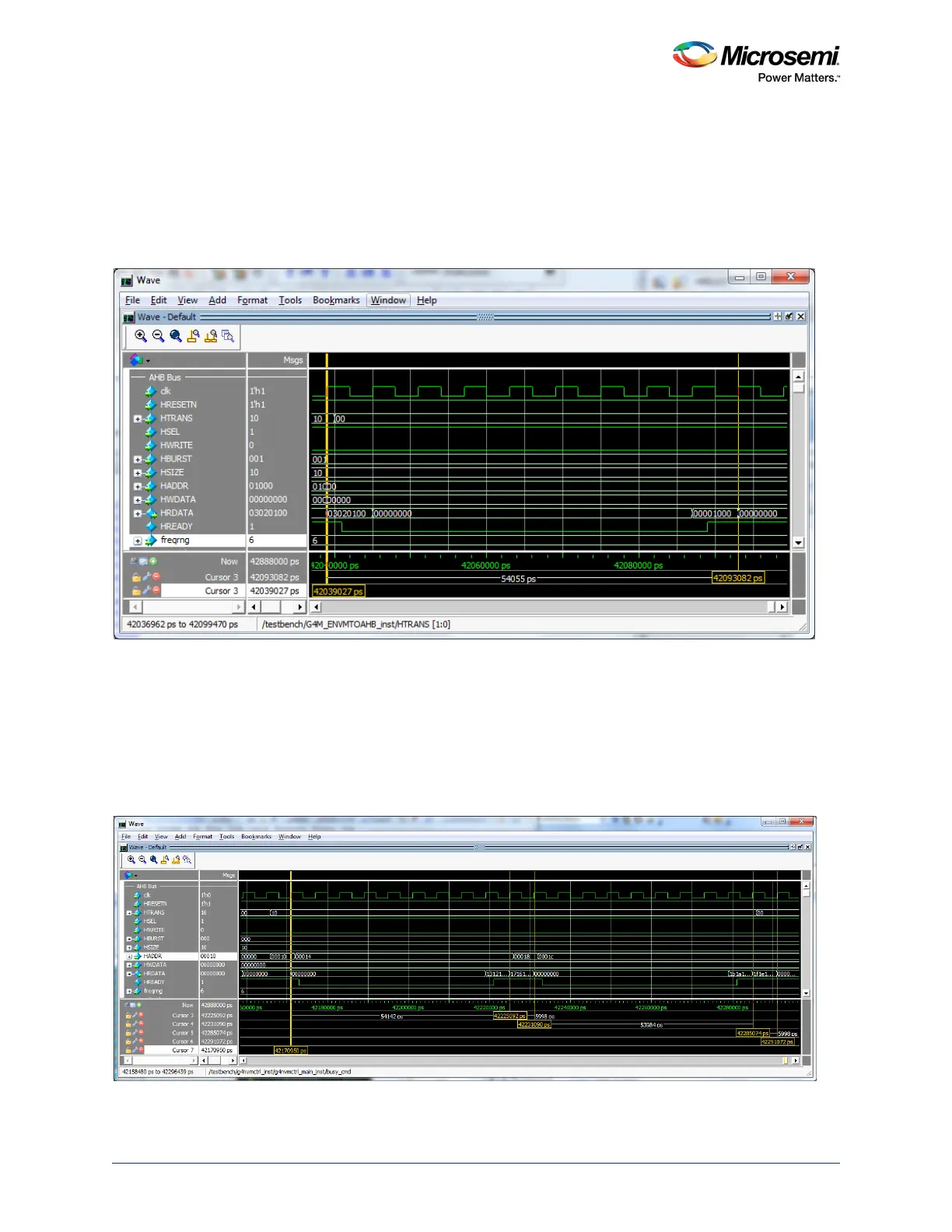 The following figure shows the AHB read command to 0x60001000 starting at the first cursor, and data