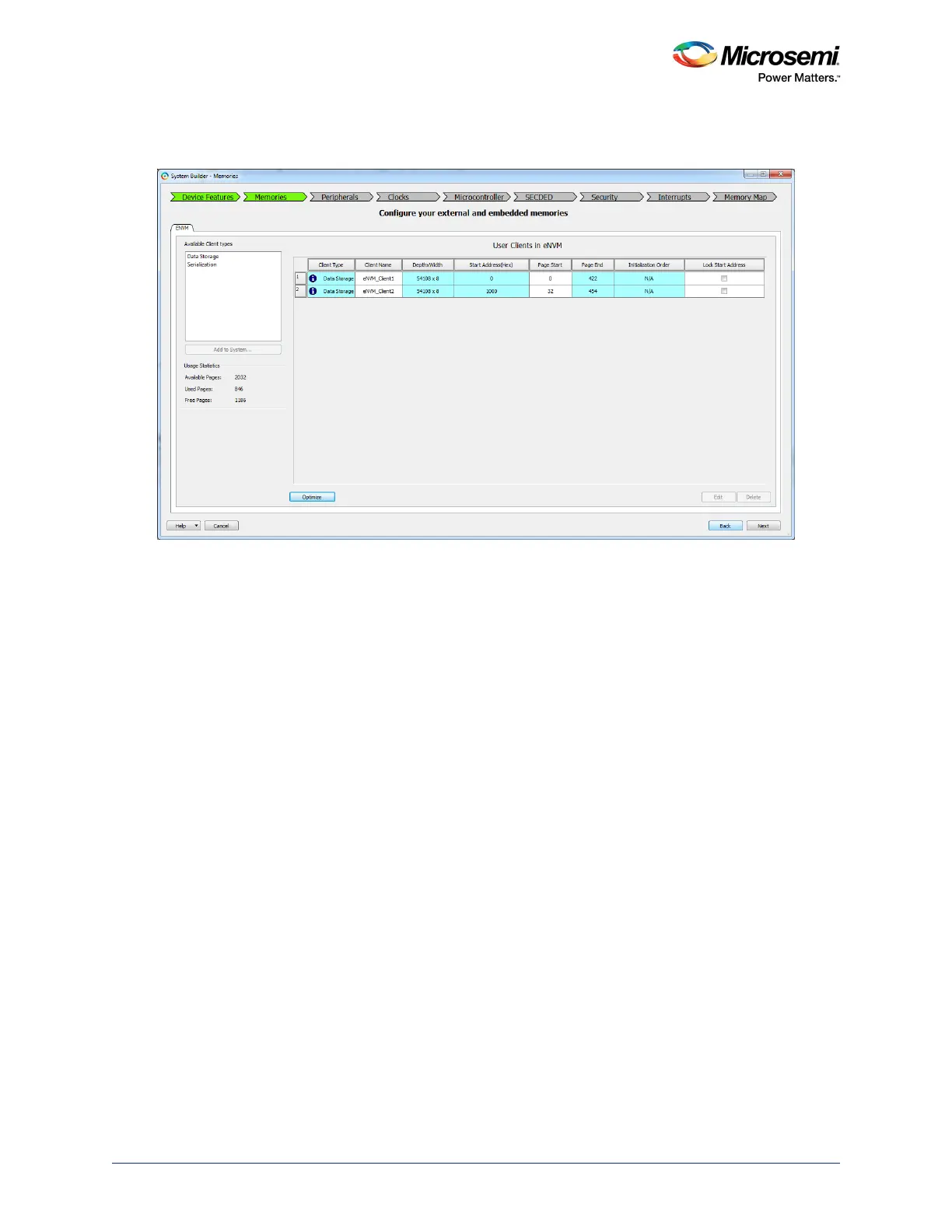 6. The eNVM client data is populated in the System Builder - Memories tab. The following figure