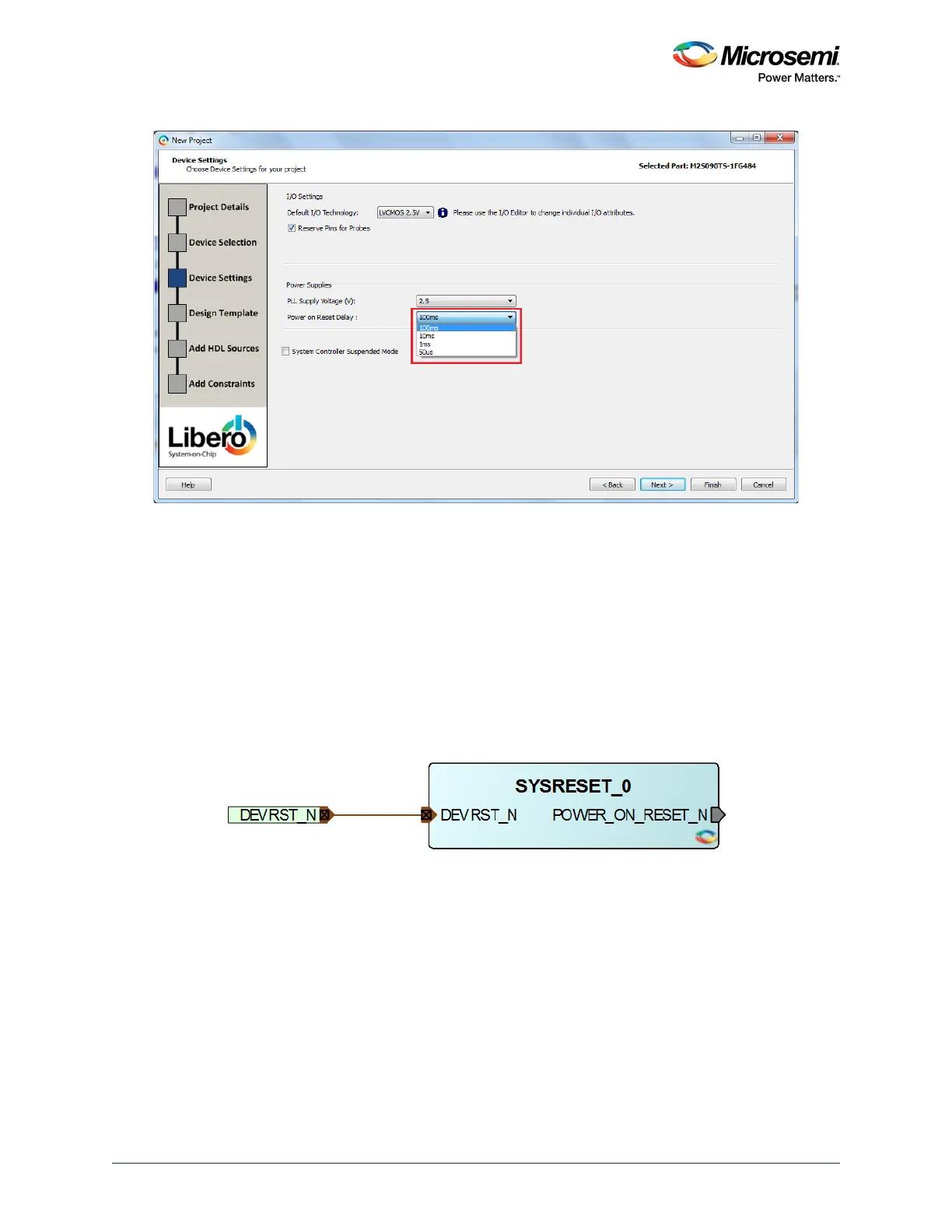instantiating the SYSRESET macro from the Libero SoC IP catalog in SmartDesign or by instantiating the