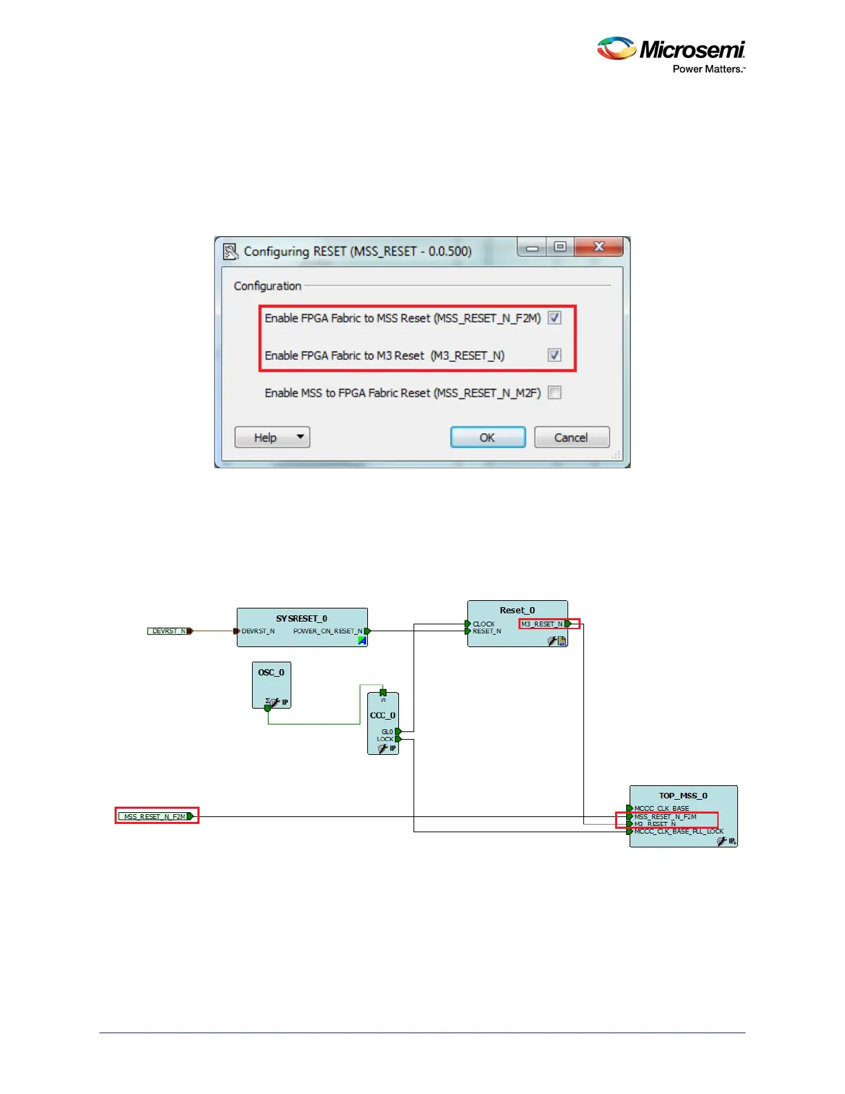 following figure. MSS_RESET_N_F2M is promoted to the top level for resetting the MSS from an