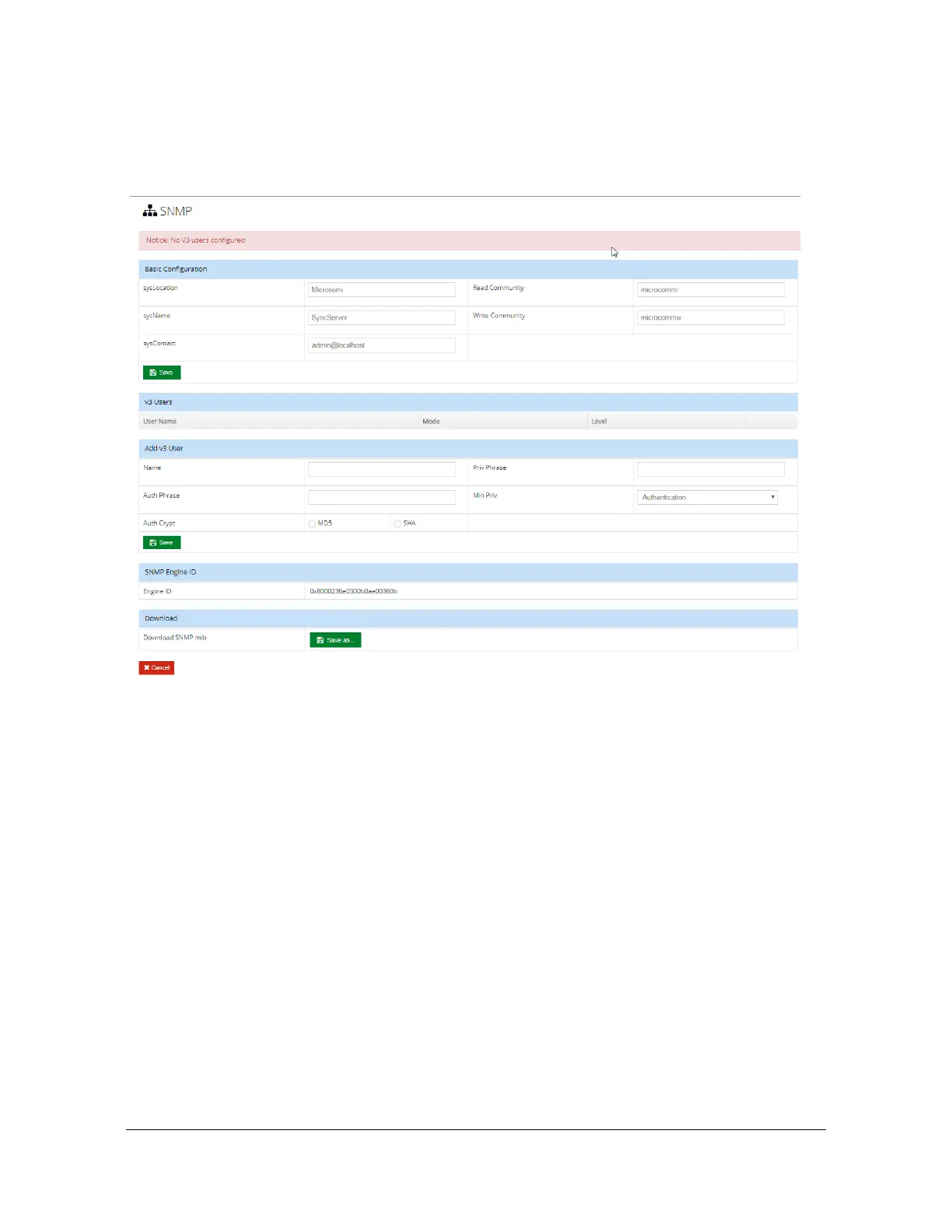 The SNMP engine ID is displayed for the user's convenience. The SNMP MIB files