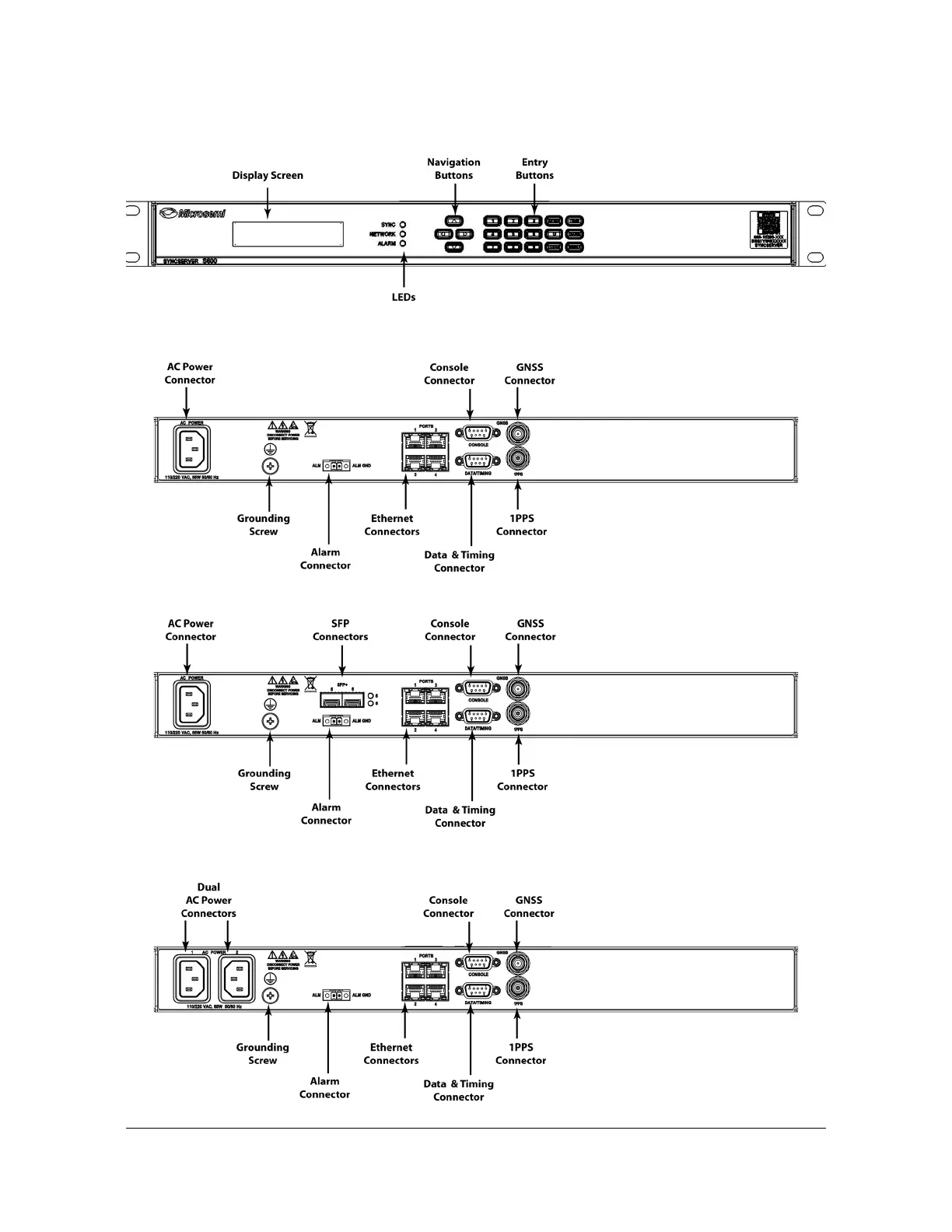 Microsemi SyncServer S650 - Syncserver S600 Front Panel; Syncserver S600 Rear Panel - Single AC Version; Syncserver S600 Rear Panel - Dual AC Version; Syncserver S650 Rear Panel - Single AC Version