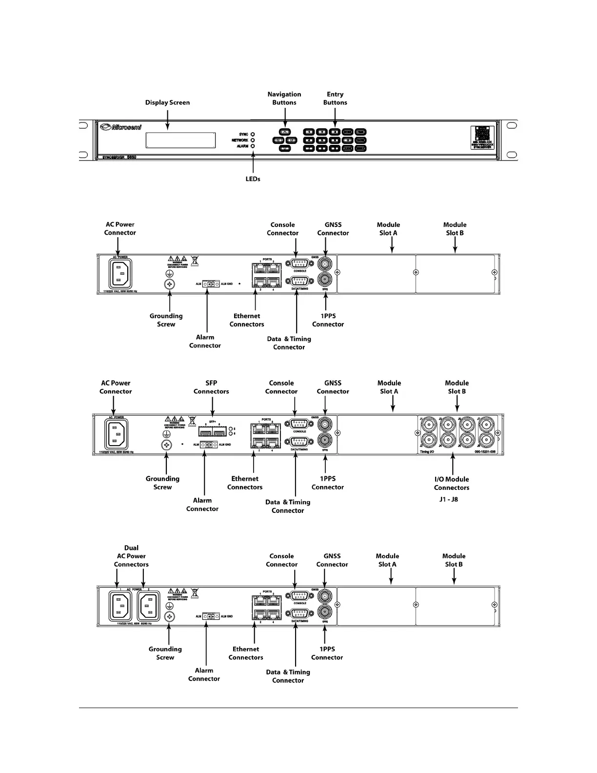 Microsemi SyncServer S650 - Syncserver S650 Rear Panel - Single AC Version with 10 Gbe; Syncserver S650 Front Panel; Syncserver S650 Rear Panel - Dual AC Version