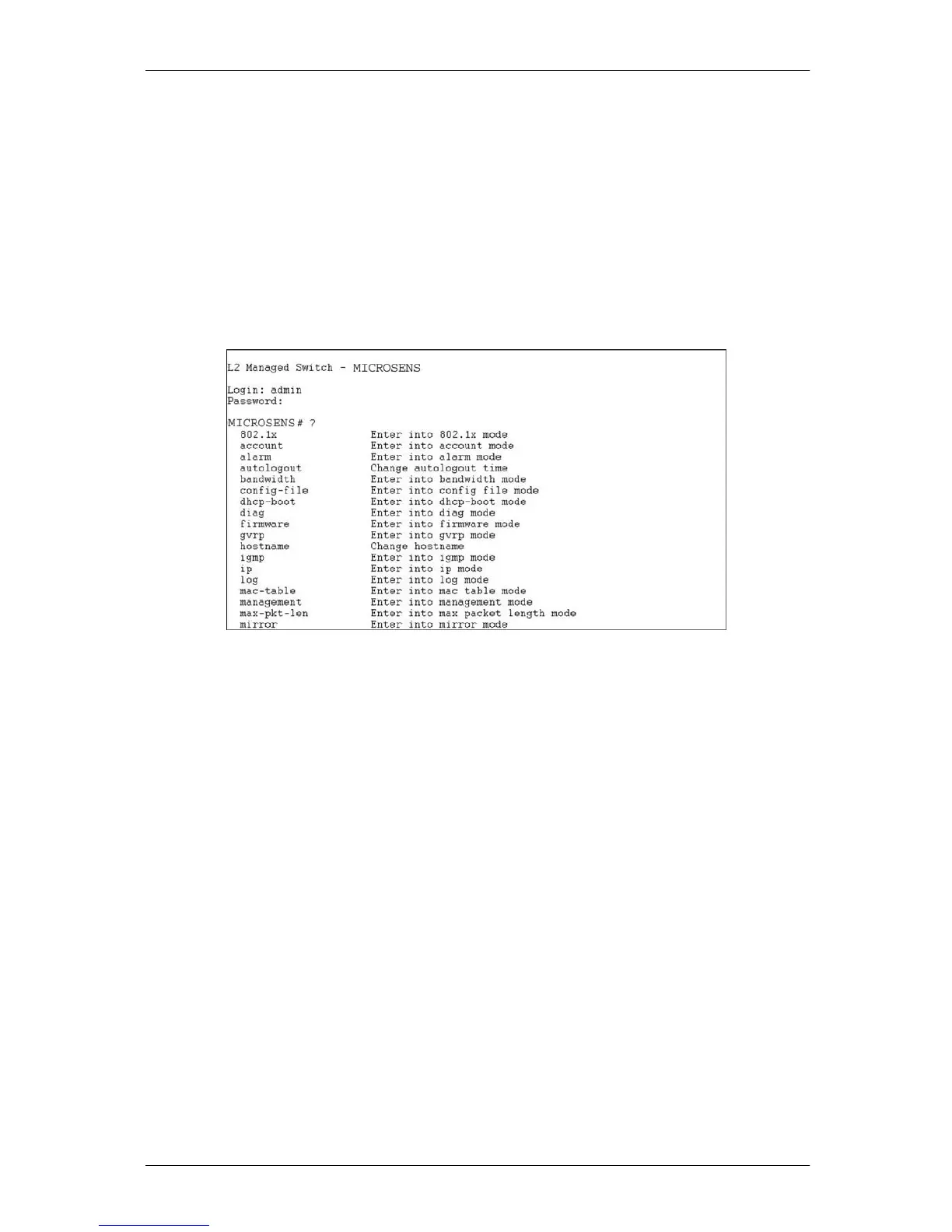 To see the commands of the mode, please input “?” after the prompt, then all commands