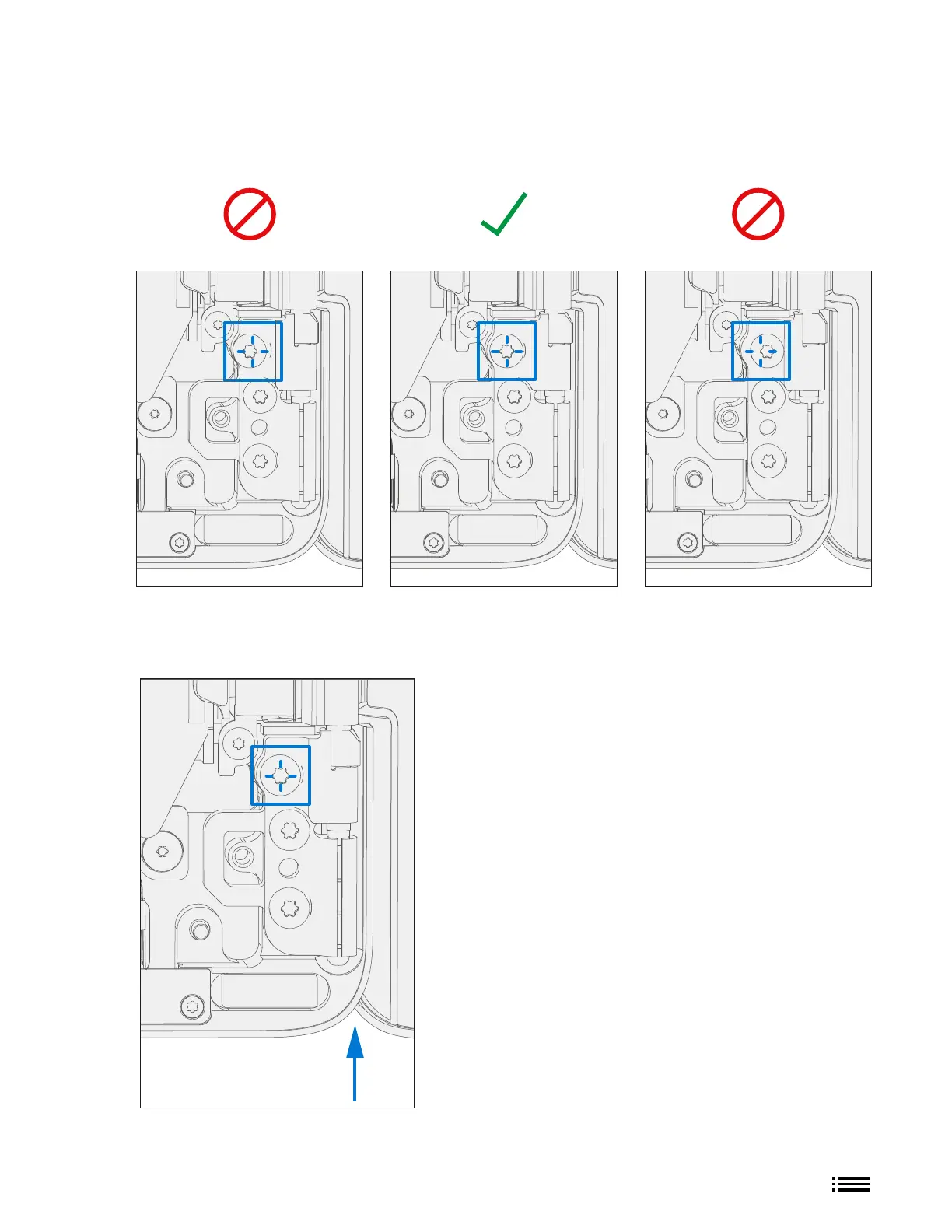 c. Secure hinge – Turn all 6 hinge screws another 90 degrees (1/4 turn) or until fully fastened.