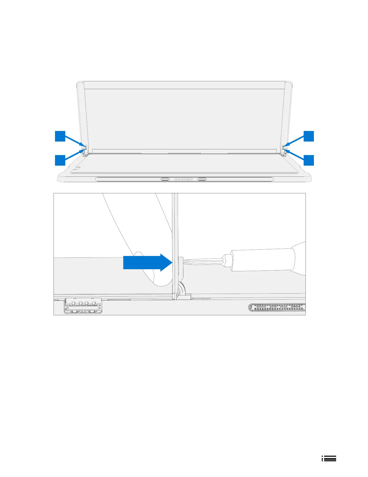 the 3IP (Torx-Plus) driver. Ensure screws do not fall into the hinge opening. Use your nger to hold the back