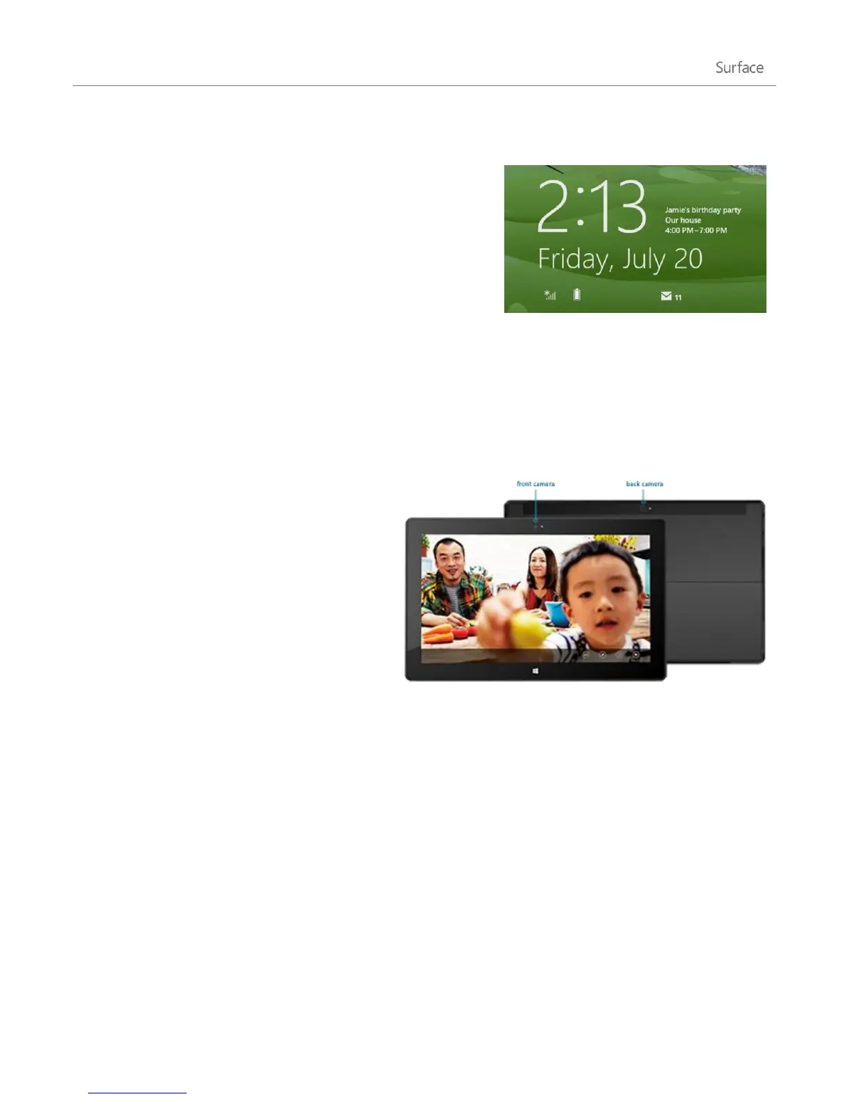 Both cameras take pictures and videos. The rear camera is angled to point straight ahead when Surface is resting
