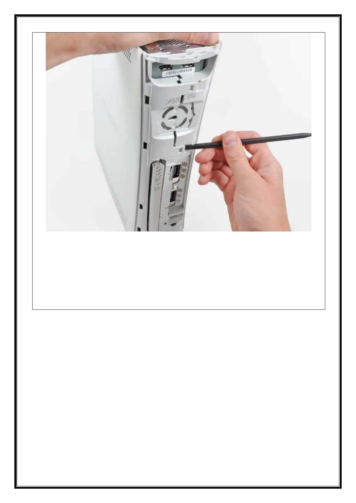 o Beneath the front-facing USB ports.