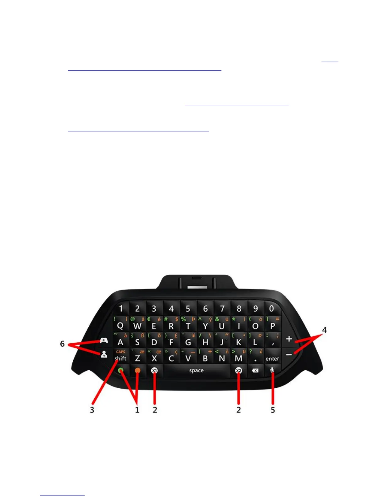 The following image illustrates the special keys and functions of the Xbox One Chatpad.