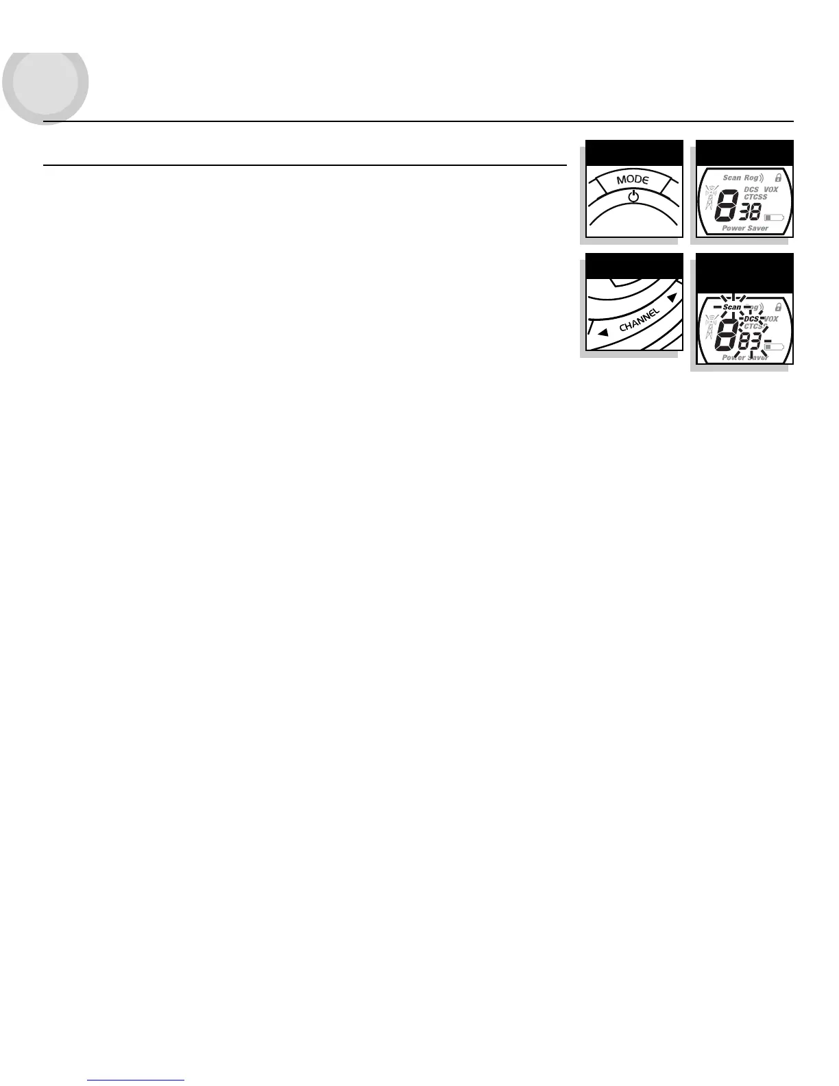 2. Press the MODE button until the SCAN icon, DCS icon and the small numbers next to the channel