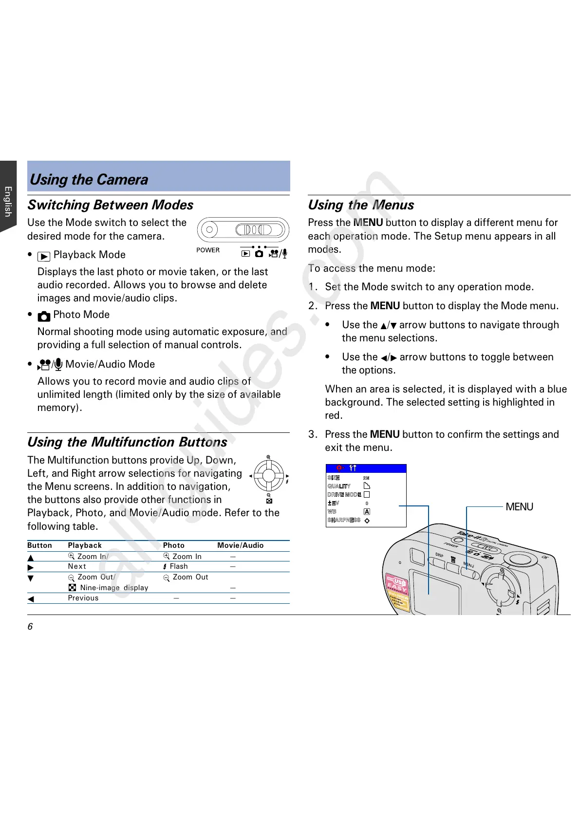 Playback, Photo, and Movie/Audio mode. Refer to the