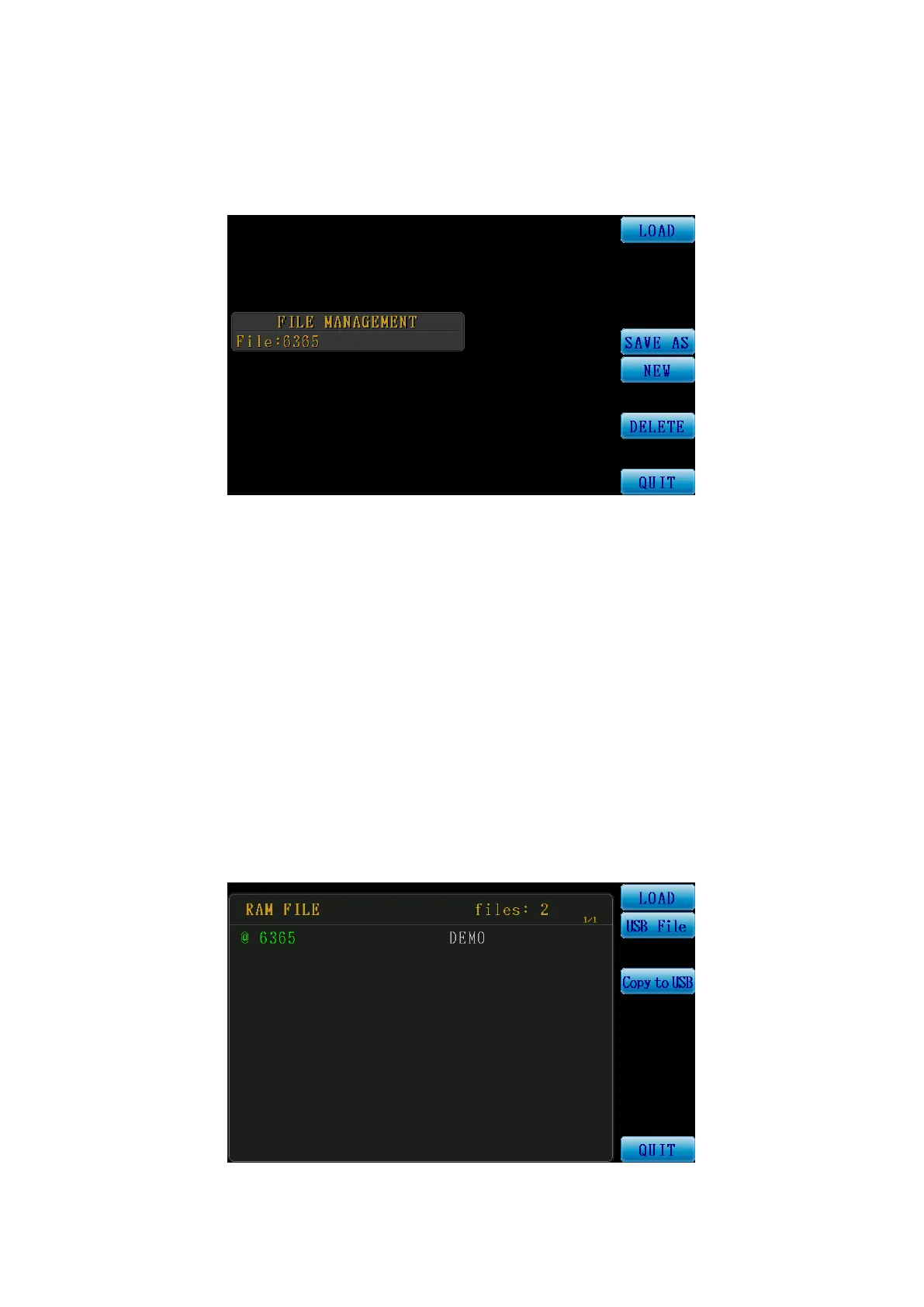 The figure below is the RAM FILE (internal file list) screen; the direction keys can be used to