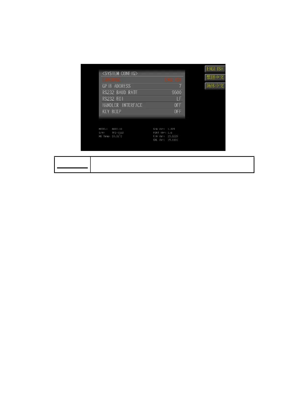 CONFIG page. The 6630 LCR Meter supports 3 language interfaces, <English>,