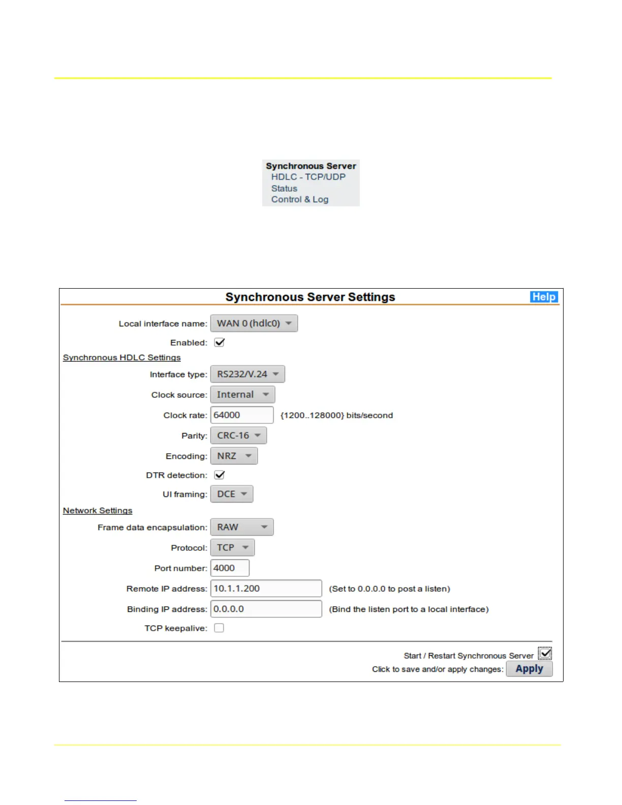 The synchronous server application provides a TCP or UDP socket connection to a synchronous/HDLC