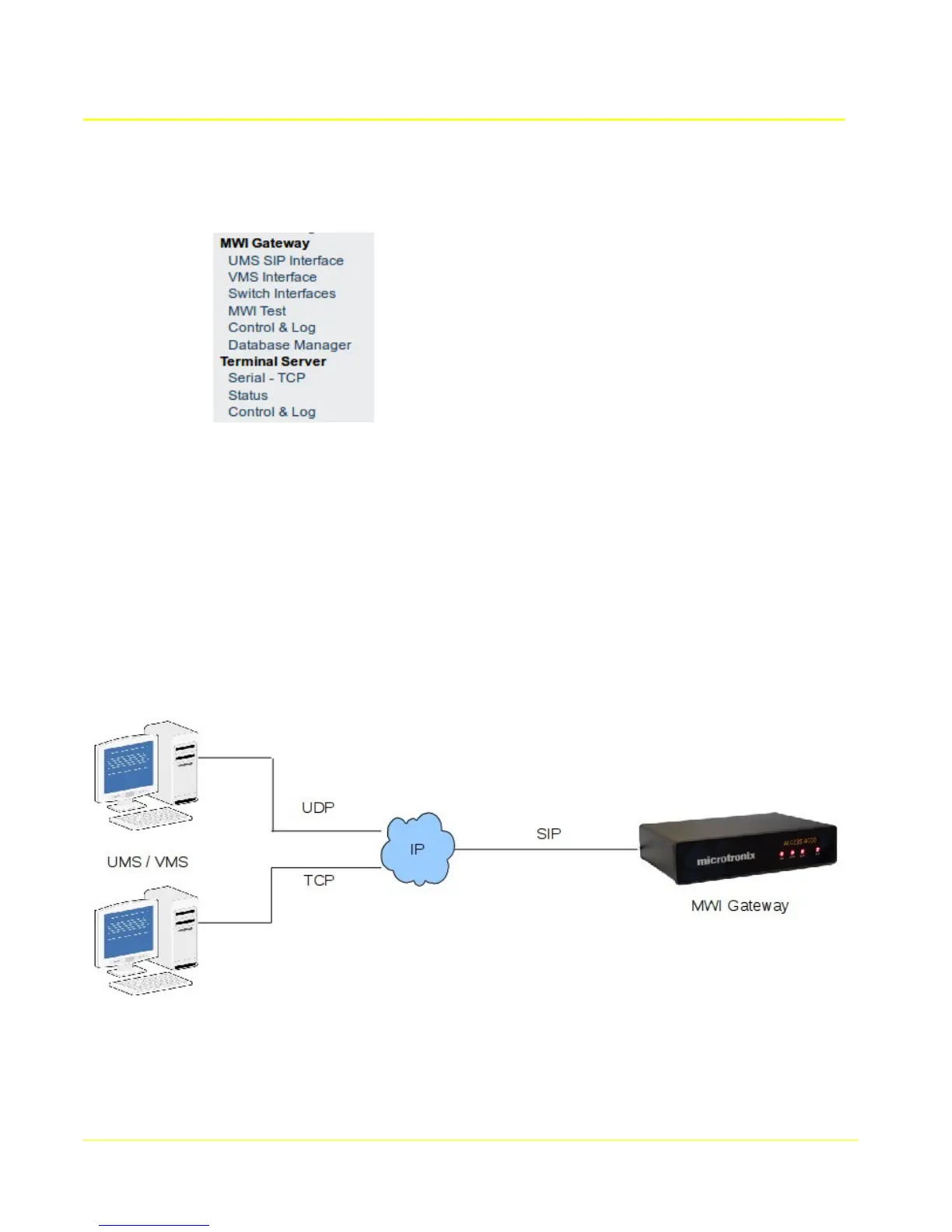 below. The UMS is configured with the IP address of the MWI Gateway and delivers unsolicited SIP