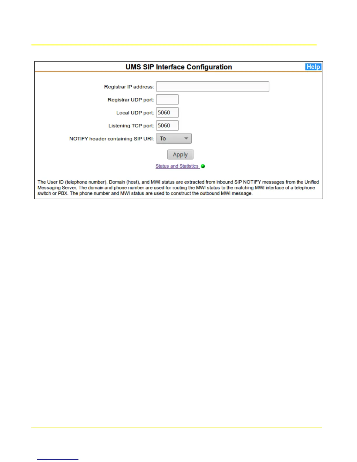 From main menu MWI Gateway section, select UMS SIP Interface to display the configuration form.