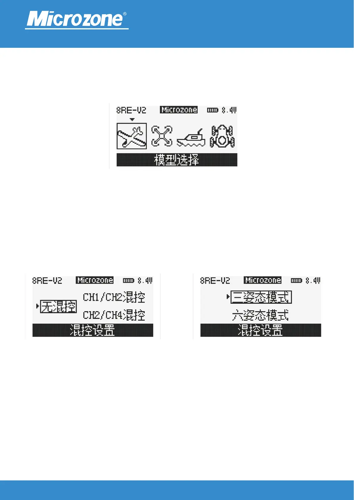 From left to right are <FIXED WING> <MULTI-AXIS> <BOAT> <CAR>; Press <UP> or <DOWN> to select the