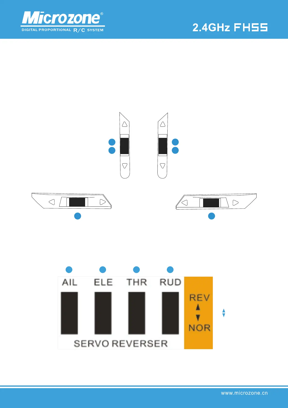 Take channel 1 as an example, when the reverse switch is pulled down, pull the joystick from left to right, the servo will swing