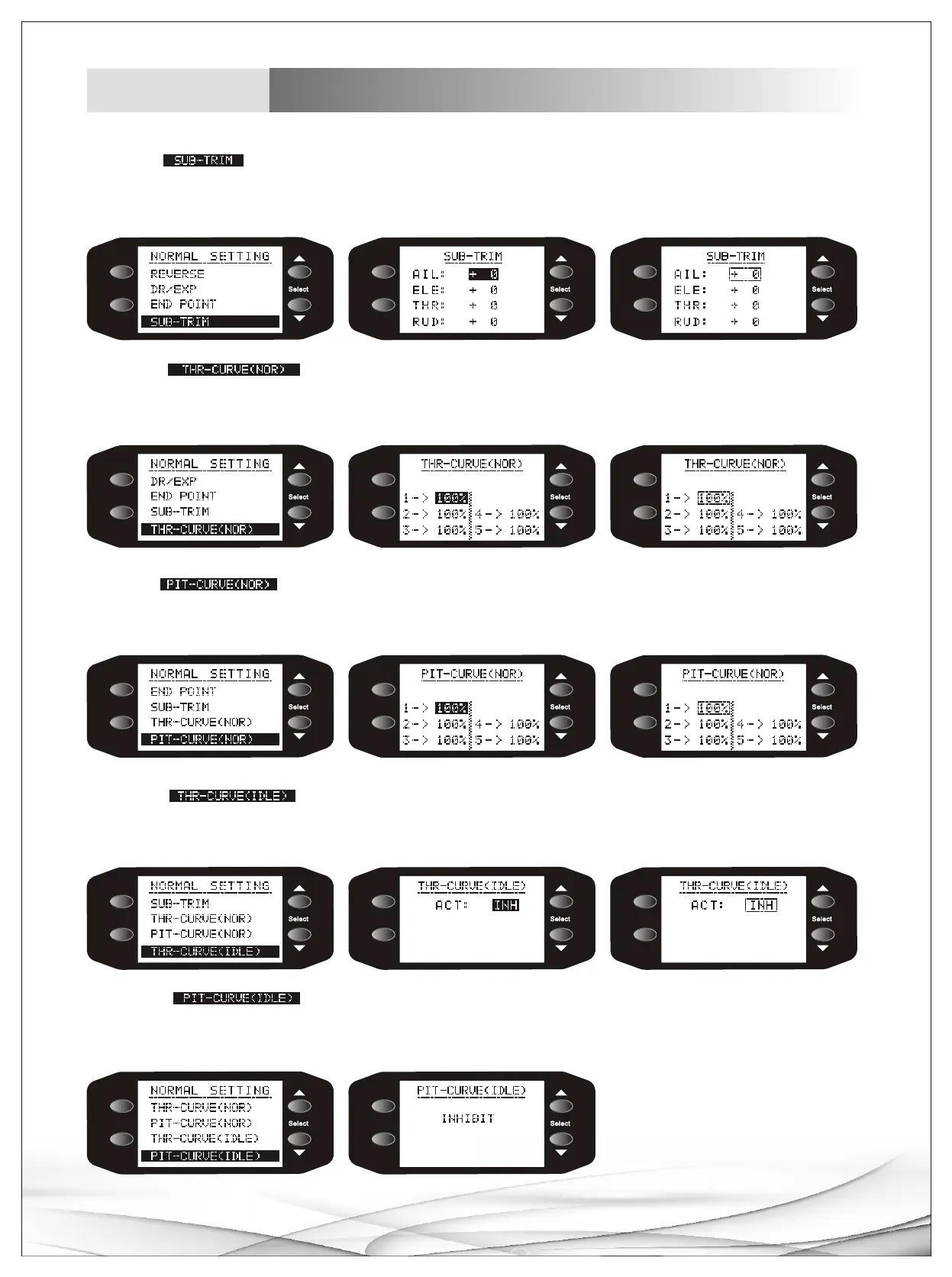 6.Choose SUB-TRIM sub-menu with +/- buttons, Press MENU button to enter sub menu, choose any title