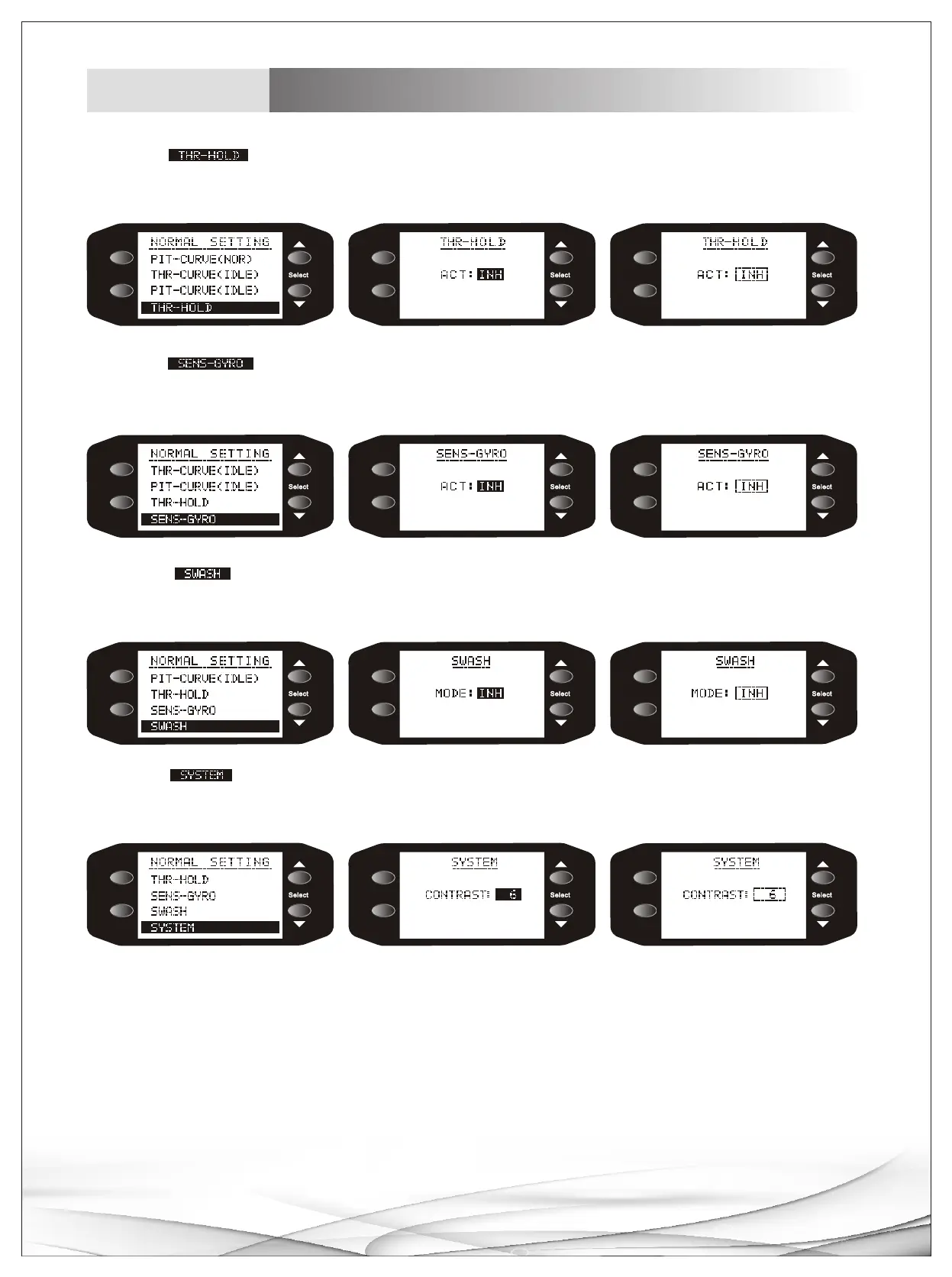 with +/- buttons, press MENU button to confirm chosen title, setup parameters with +/- buttons, press END