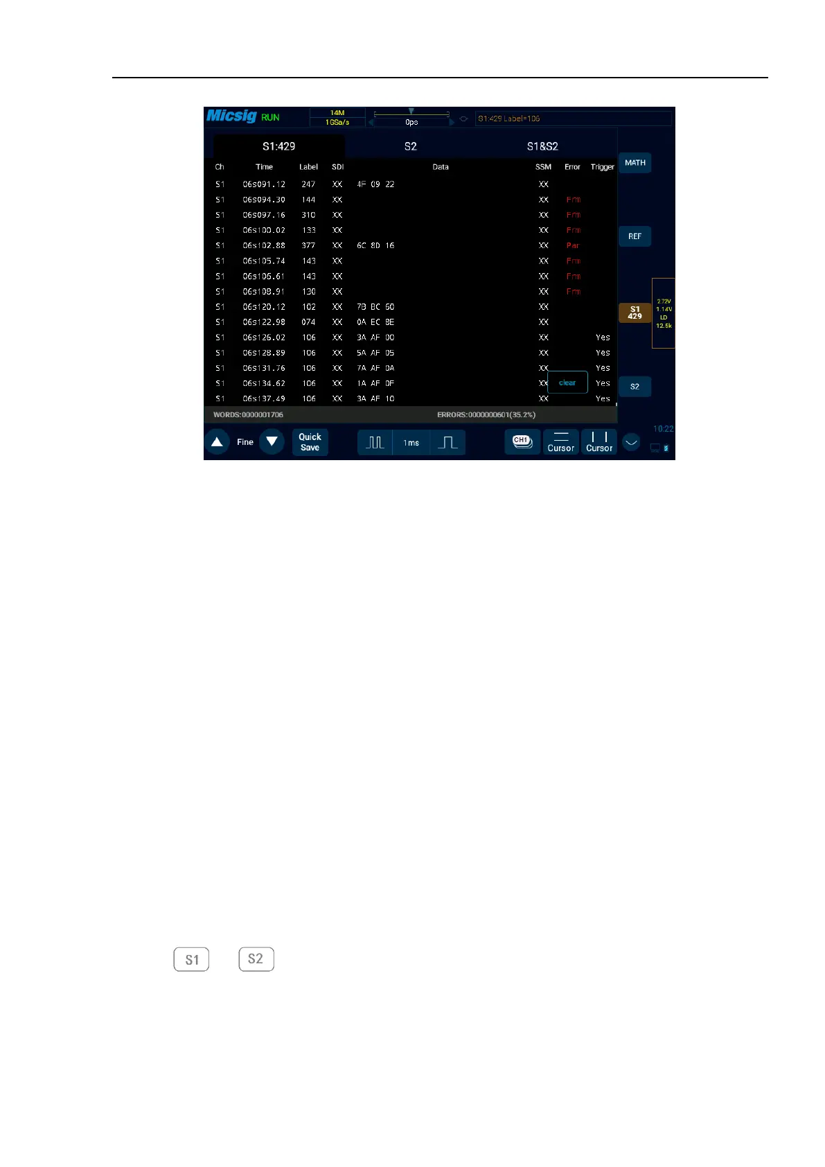 (7) “Error”: displays the frame error type (parity error Par, frame error Frm).