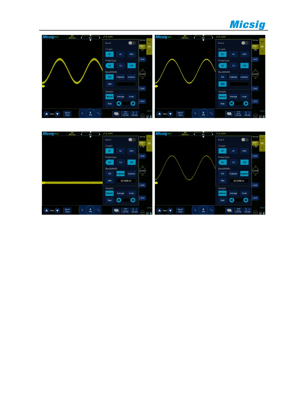 After selecting Invert, the voltage value of the displayed waveform is inverted. Inversion affects the way the