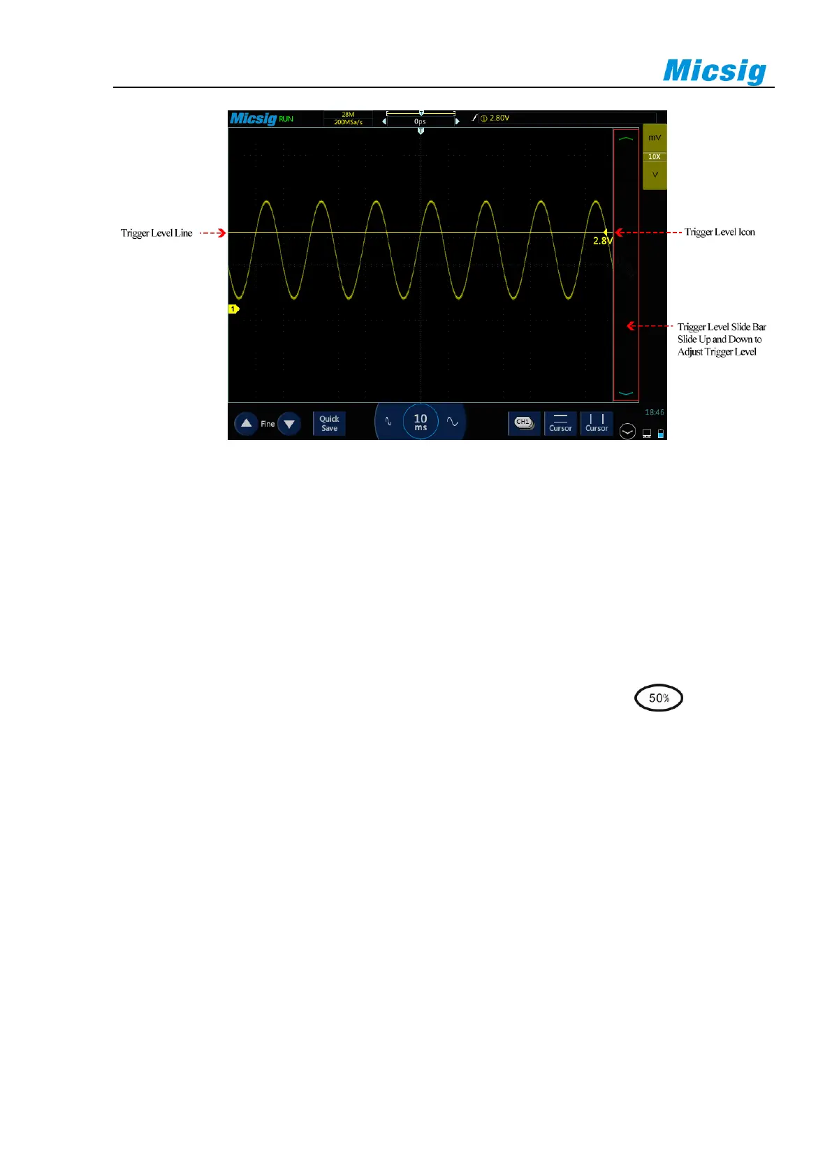 "level" item to adjust the trigger level to 50% of the waveform amplitude of the trigger source channel.