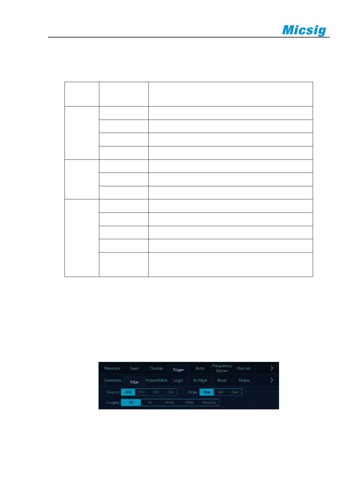 by correctly setting the edge trigger coupling mode. Edge trigger menu is shown in the table below: