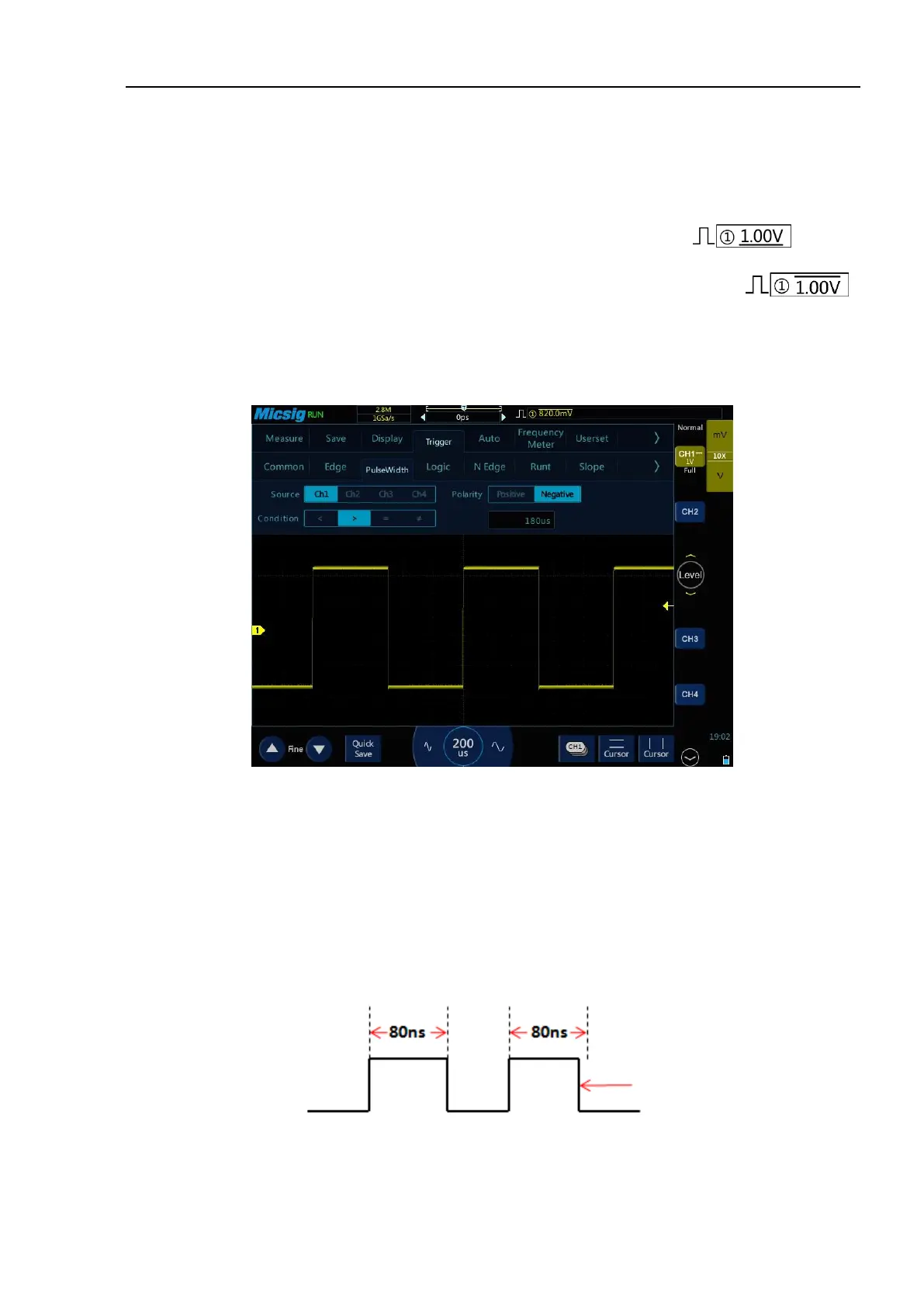 For example, for positive pulse, if it is set as T<80ns, the trigger will happen stably only when the pulse