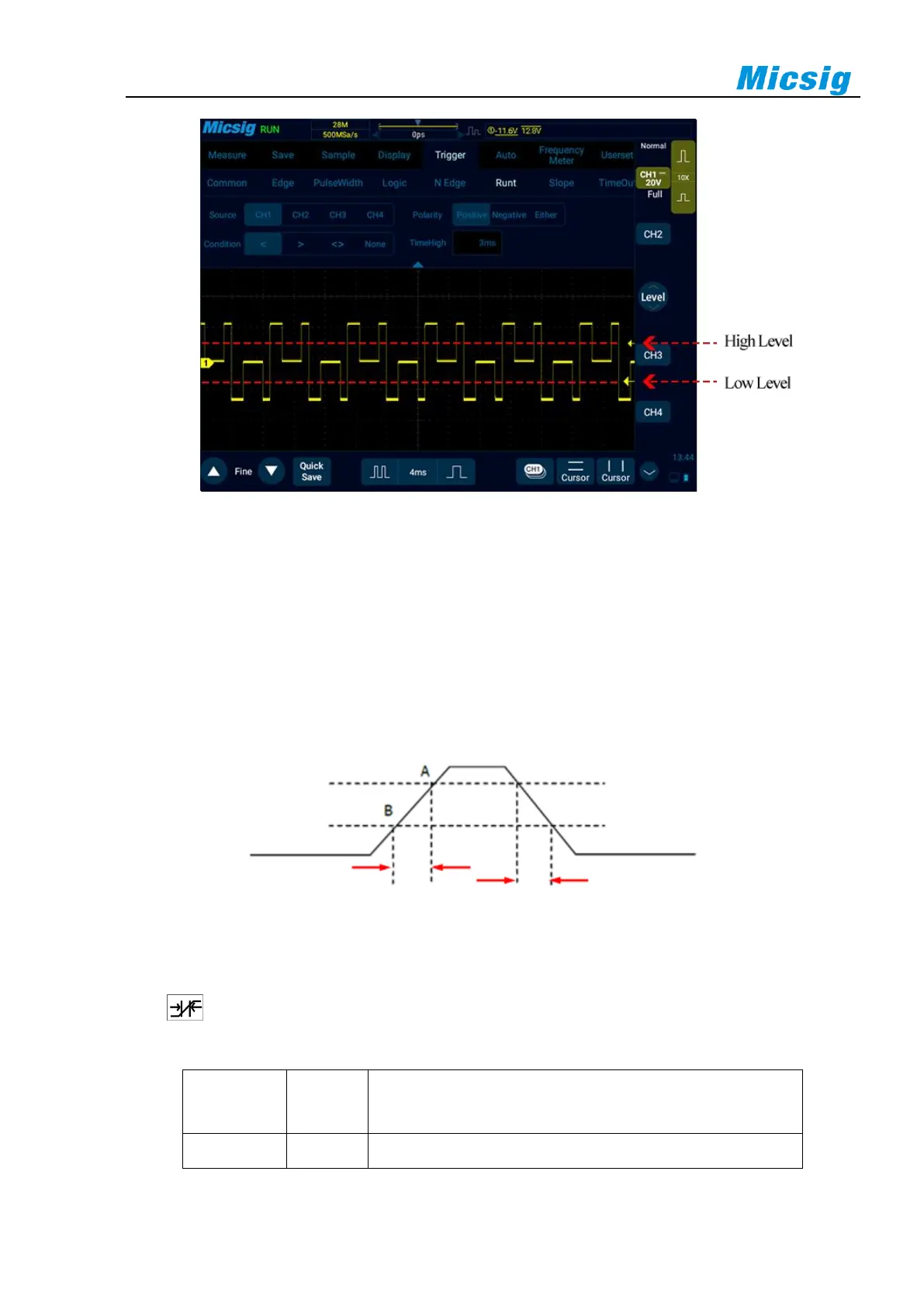 Slope Trigger means trigger when the waveform reaches a set time condition from one level to another.