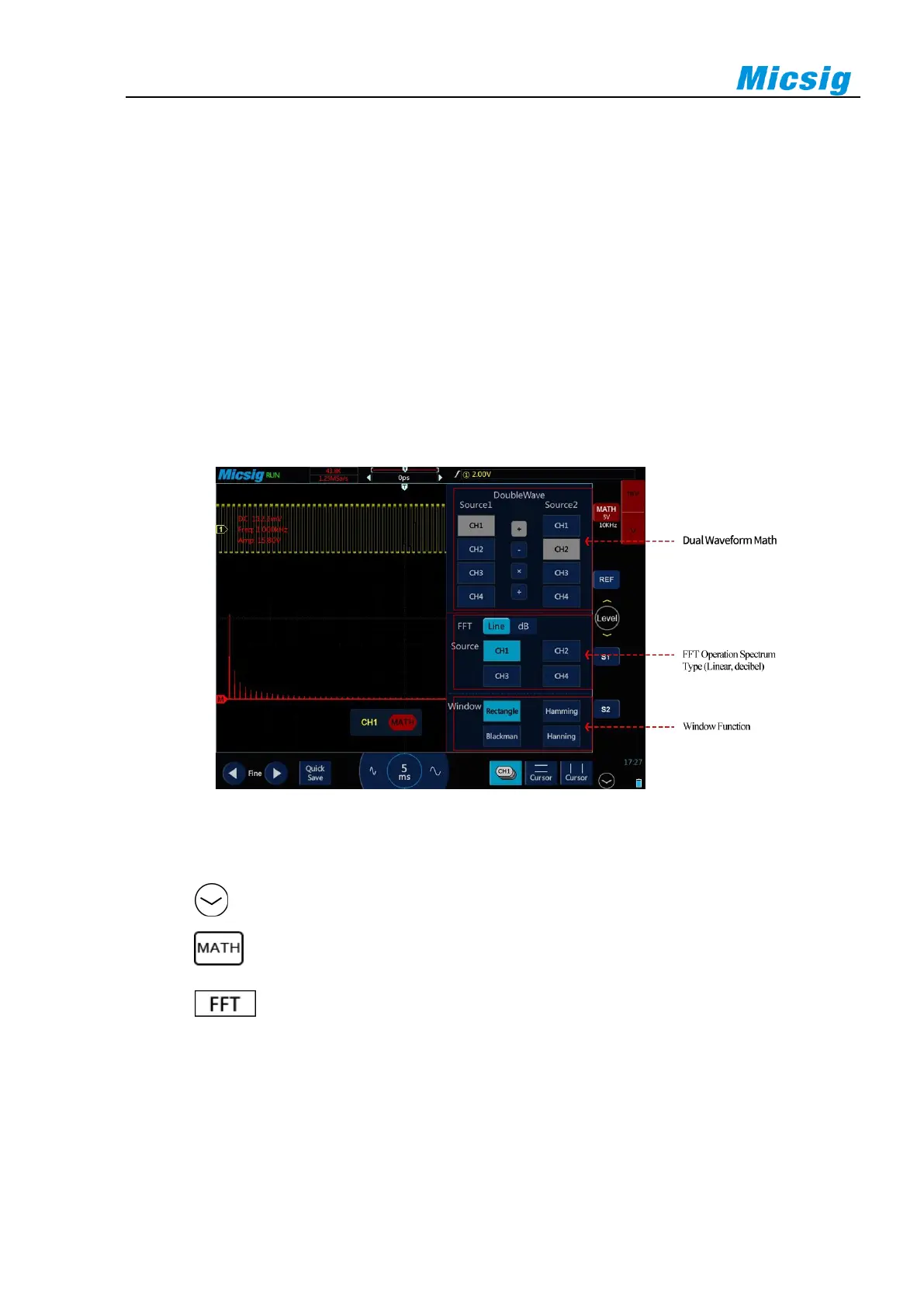 key to cycle through the math channel, open the math channel menu, and close the math channel.