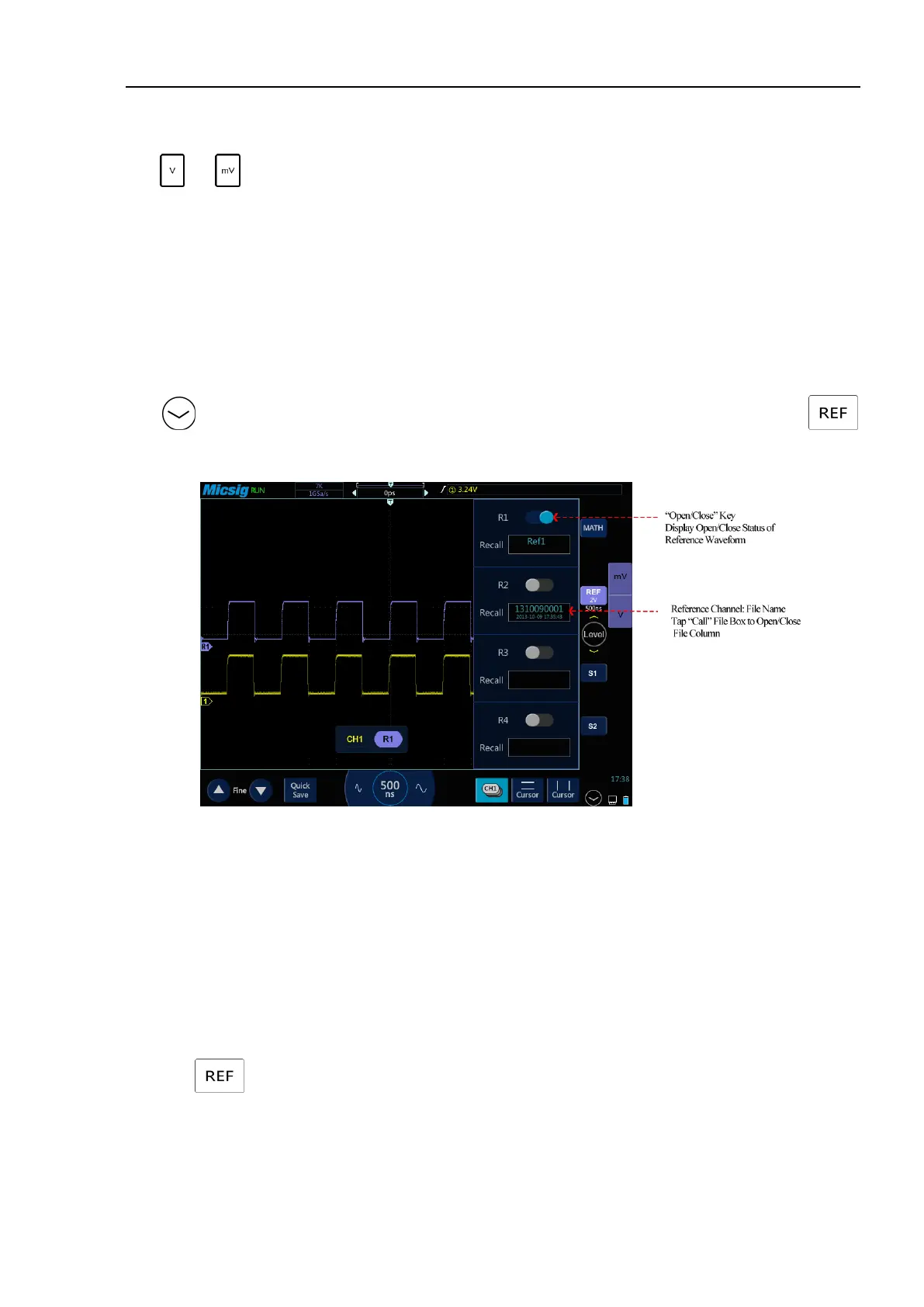 When there are already waveforms loaded into the reference channel, click “Open/Close” button to open or close