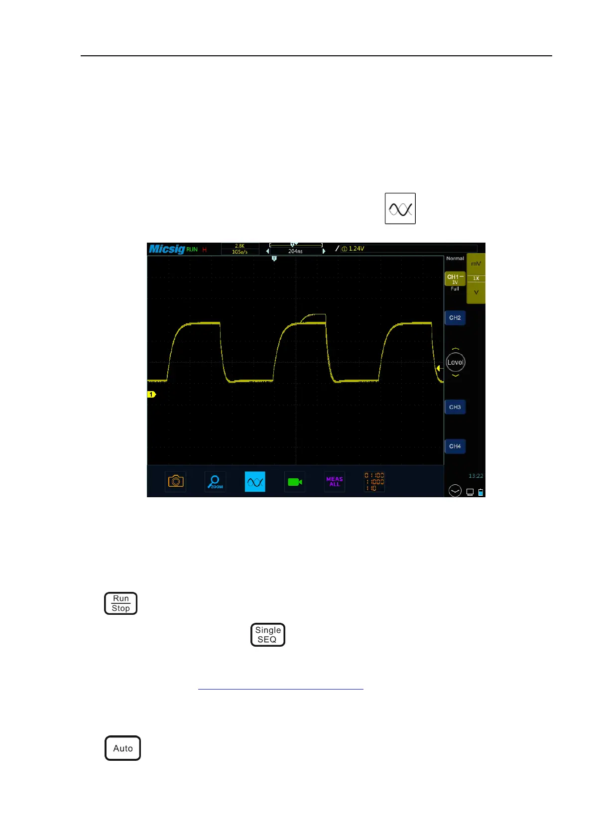 the waveform will continue to run; Tap to conduct single acquisition, and the oscilloscope will display