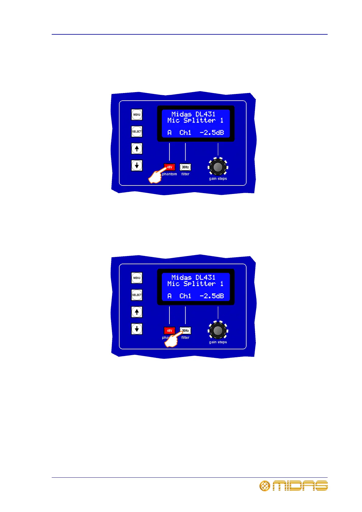 by pressing the 48V switch on the control panel. The 48V LED in the channel’s panel