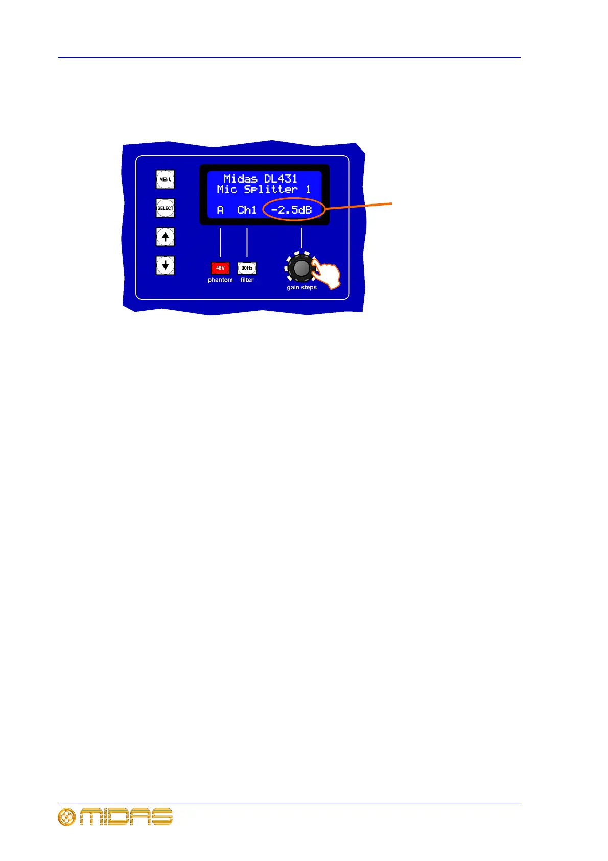 After selecting the appropriate channel, adjust the gain steps control knob on the