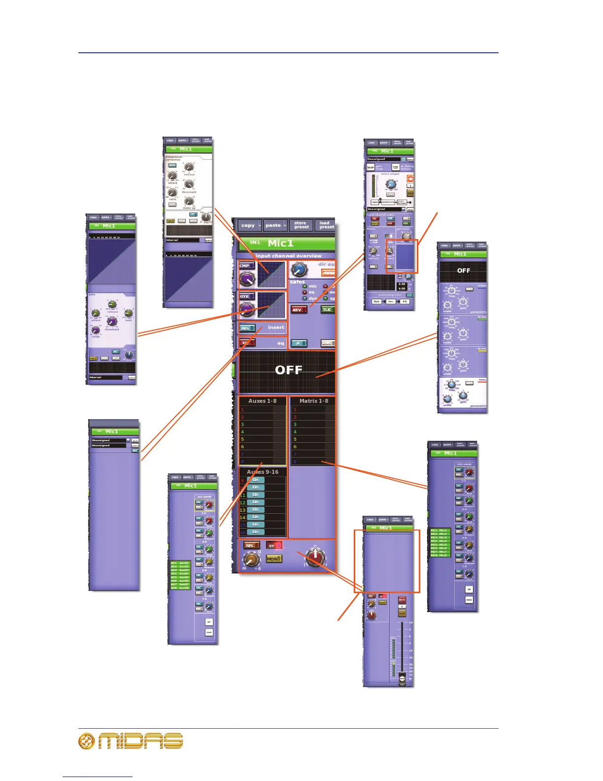 For details of how to navigate the GUI channel strip, see “About GUI navigation” on