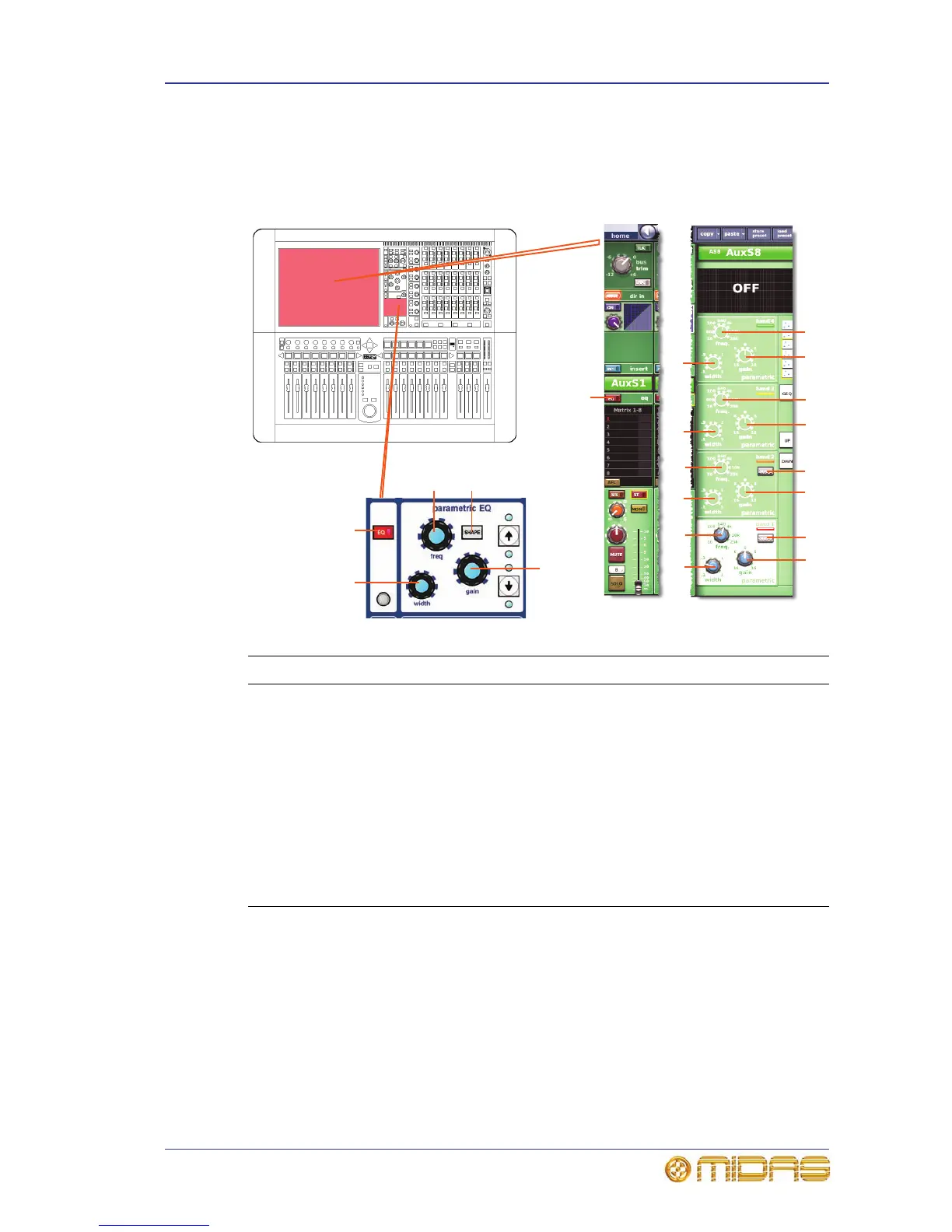 and shows the EQ detail area in the GUI channel strip and the GEQ window on the GUI