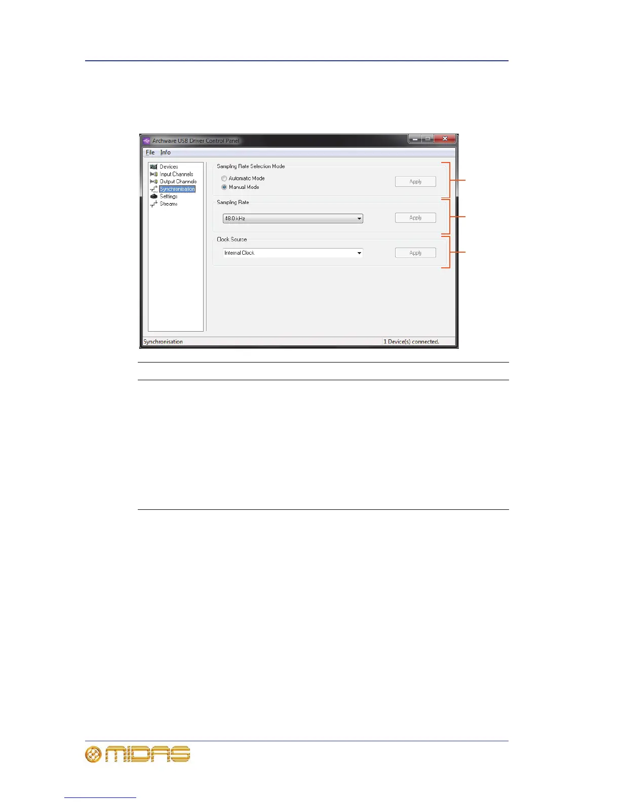 manually as 44.1kHz or 48.0kHz. The Apply button stores any changes