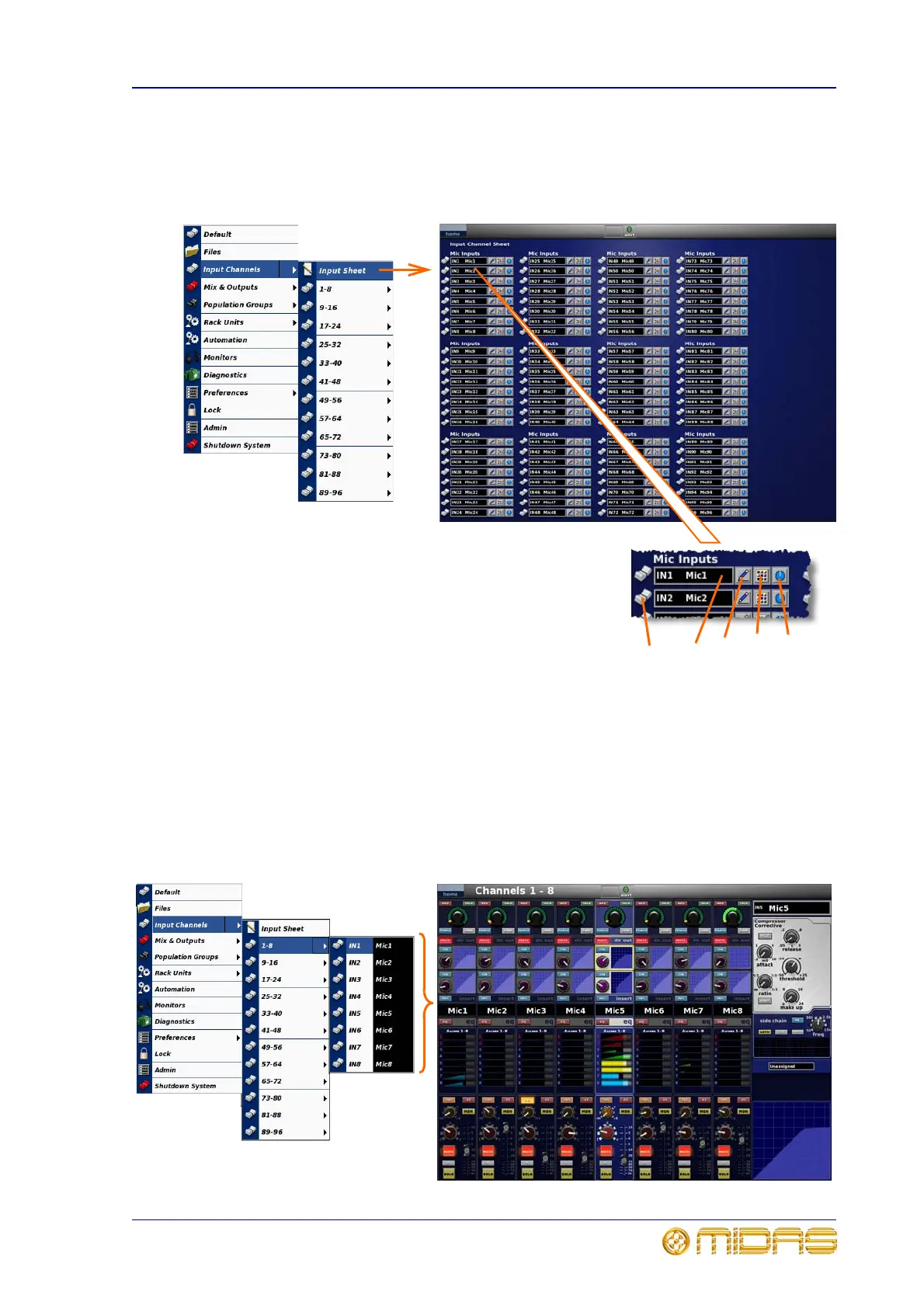 screens are similar, only the bank 1-8 screen is shown here. Refer to “Input bay GUI”