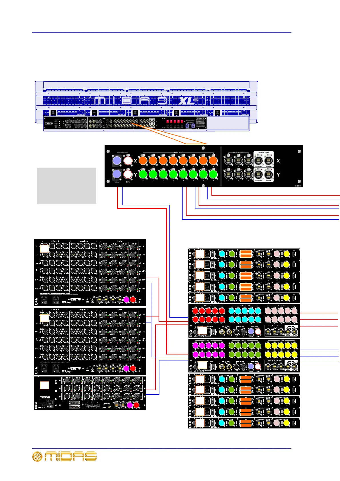 This diagram shows the network interconnections for a typical FOH XL8 system.