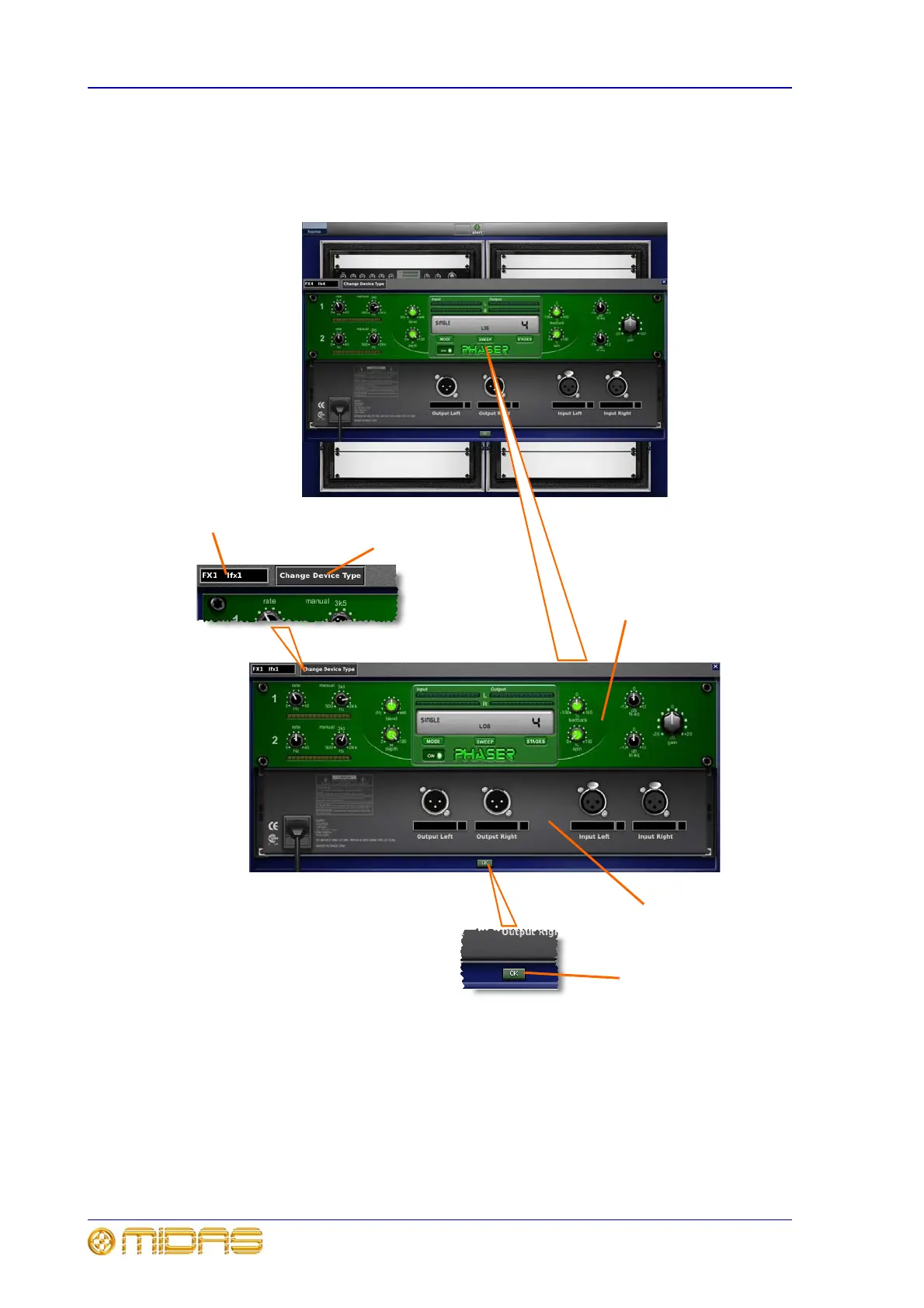The phaser effect consists of one, or if configured for dual operation, two stereo phasers