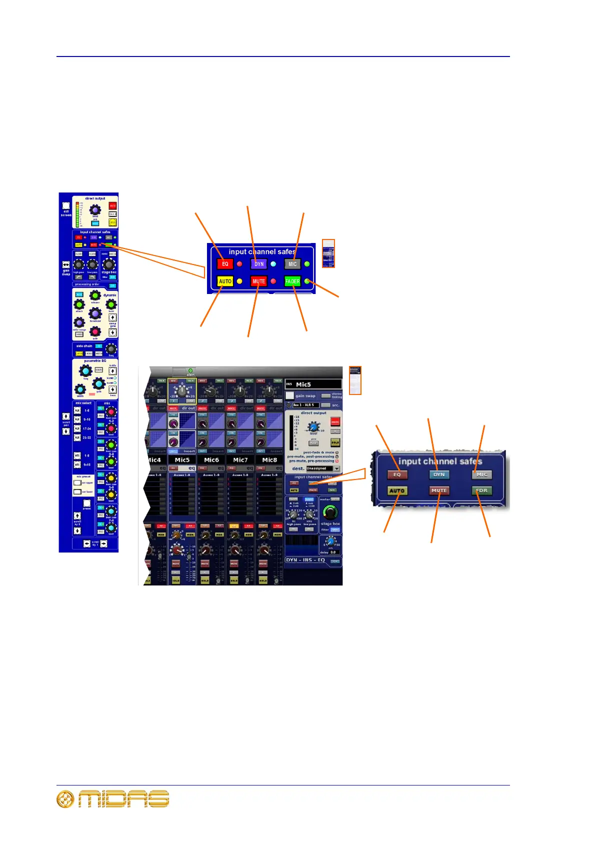 The input channel safes section in the input channel strip has six ‘safe’ switches that