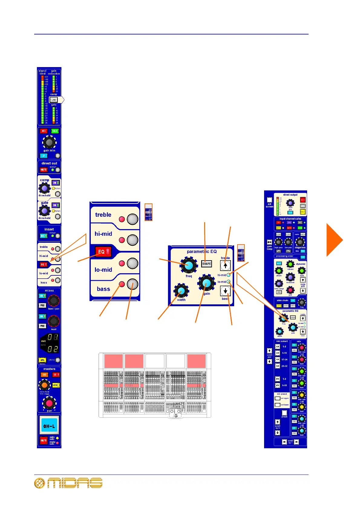 parametric EQ section (E zone) has freq, width and gain control knobs, which are