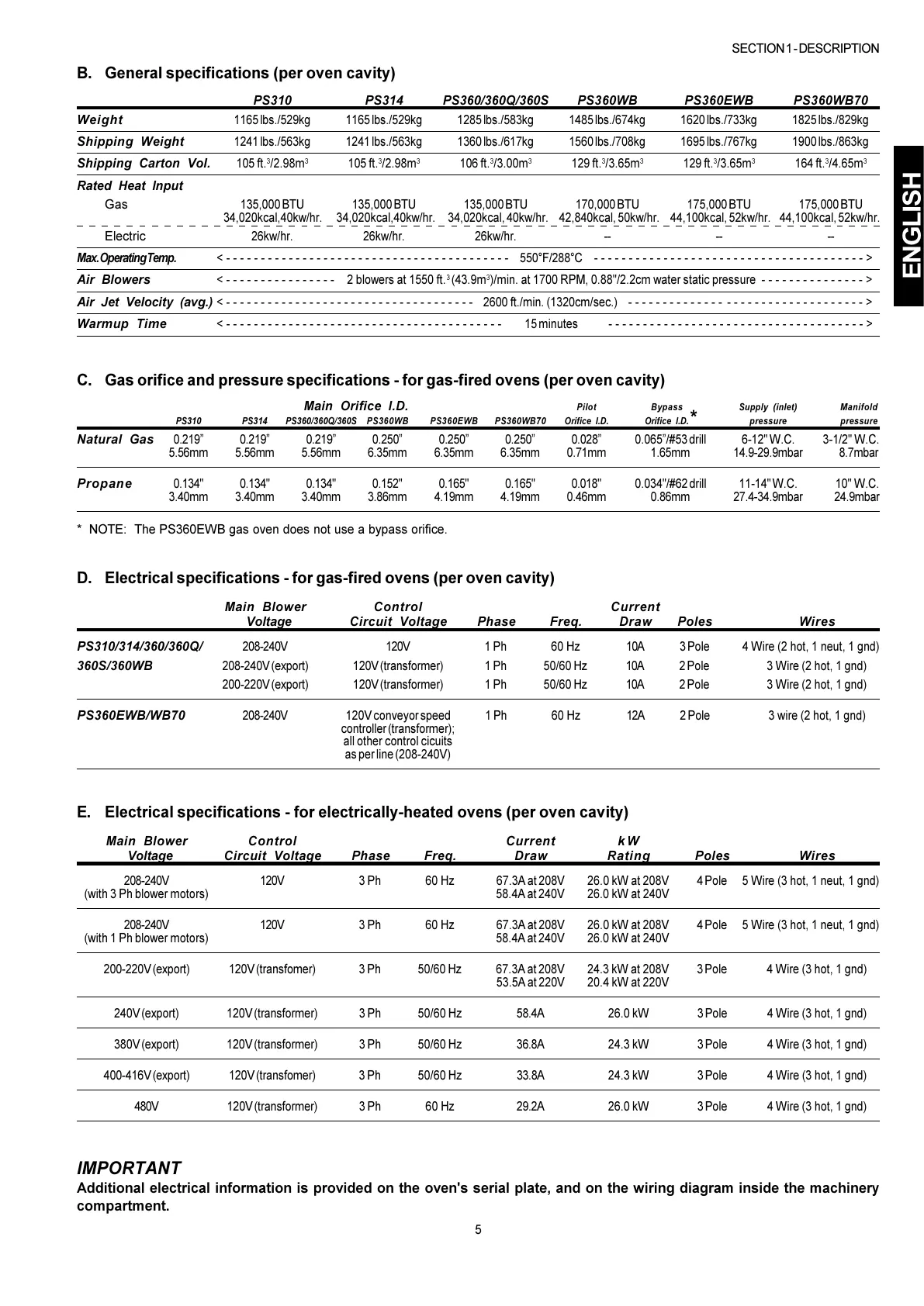 E. Electrical specifications - for electrically-heated ovens (per oven cavity)