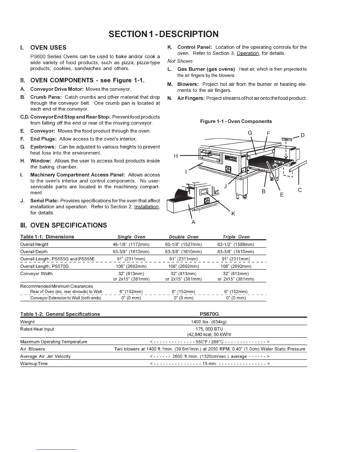 Middleby Marshall PS670 - Oven Description and Specifications; Oven Uses and Applications; Oven Component Identification; PS670 Series Oven Specifications
