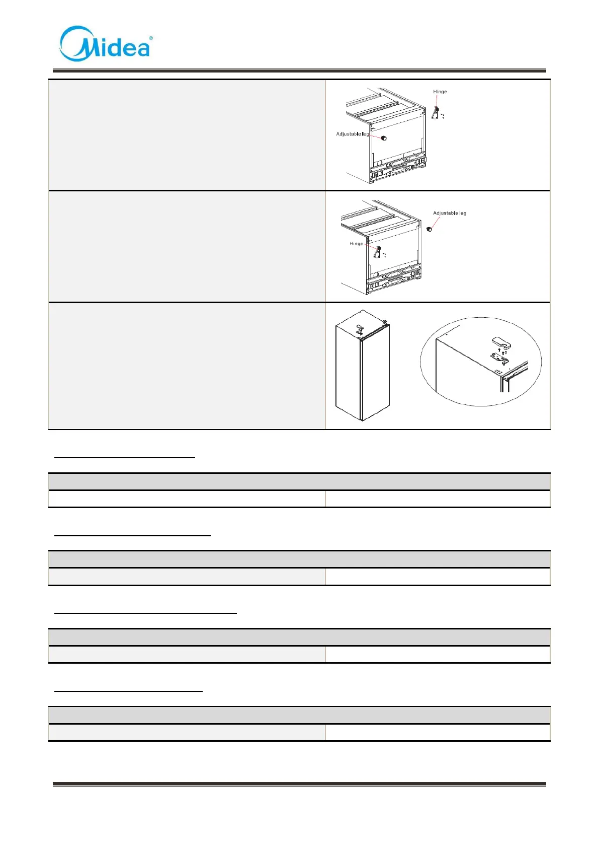 4) 6) Install the lower hinge and adjustable leg on lower left