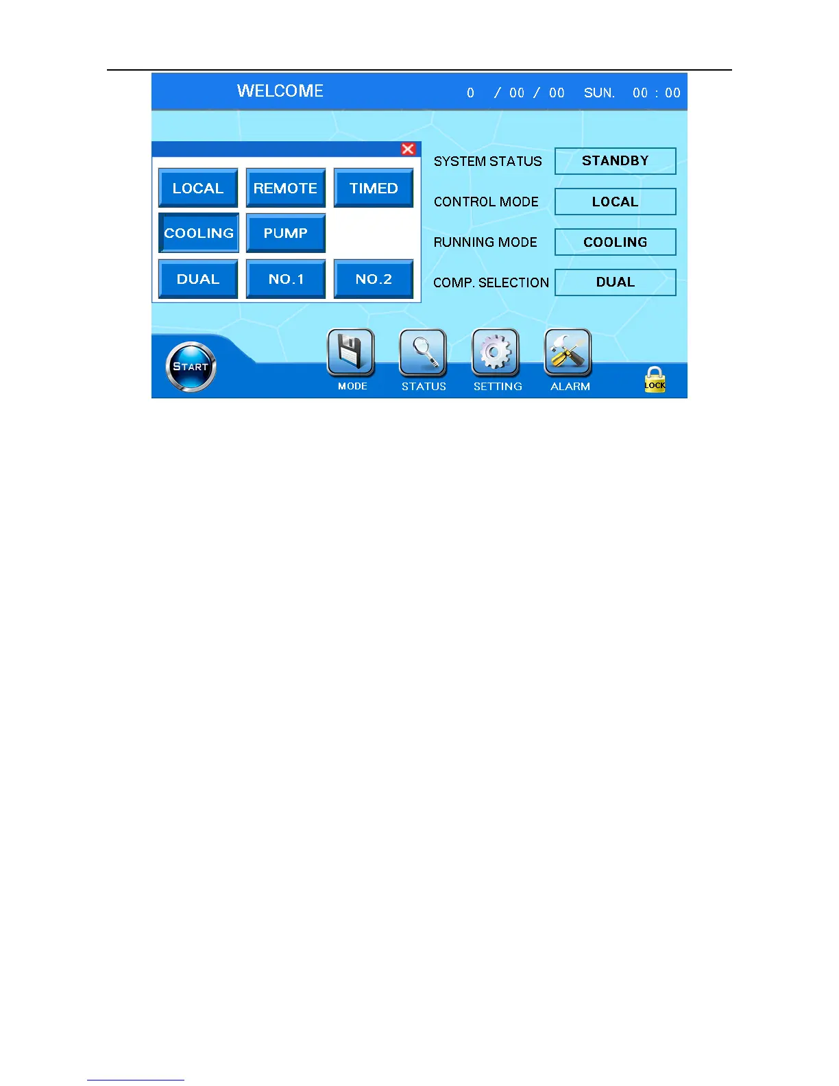 Set control mode(Local, remote, timer),operating mode(cooling, heating, pumping) and single or