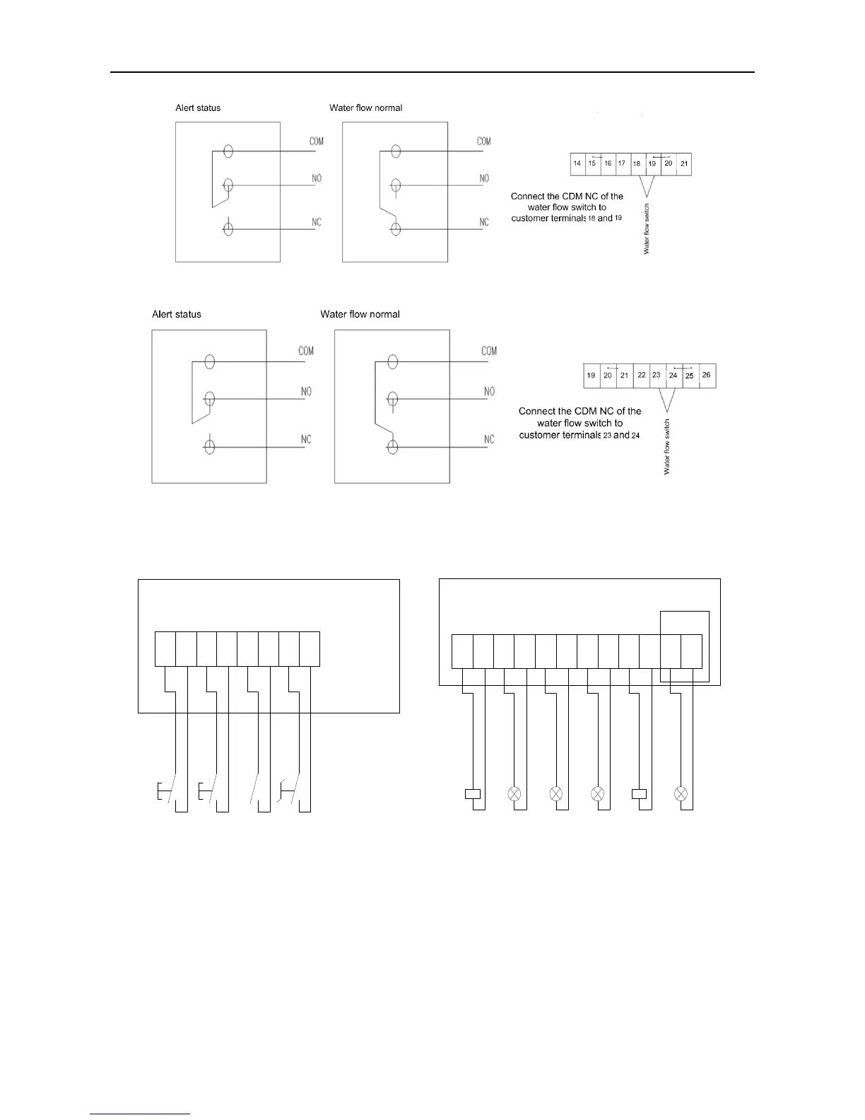 The wiring ports for remote start/stop, flow switch, water pump linked control, alarm indication, etc.